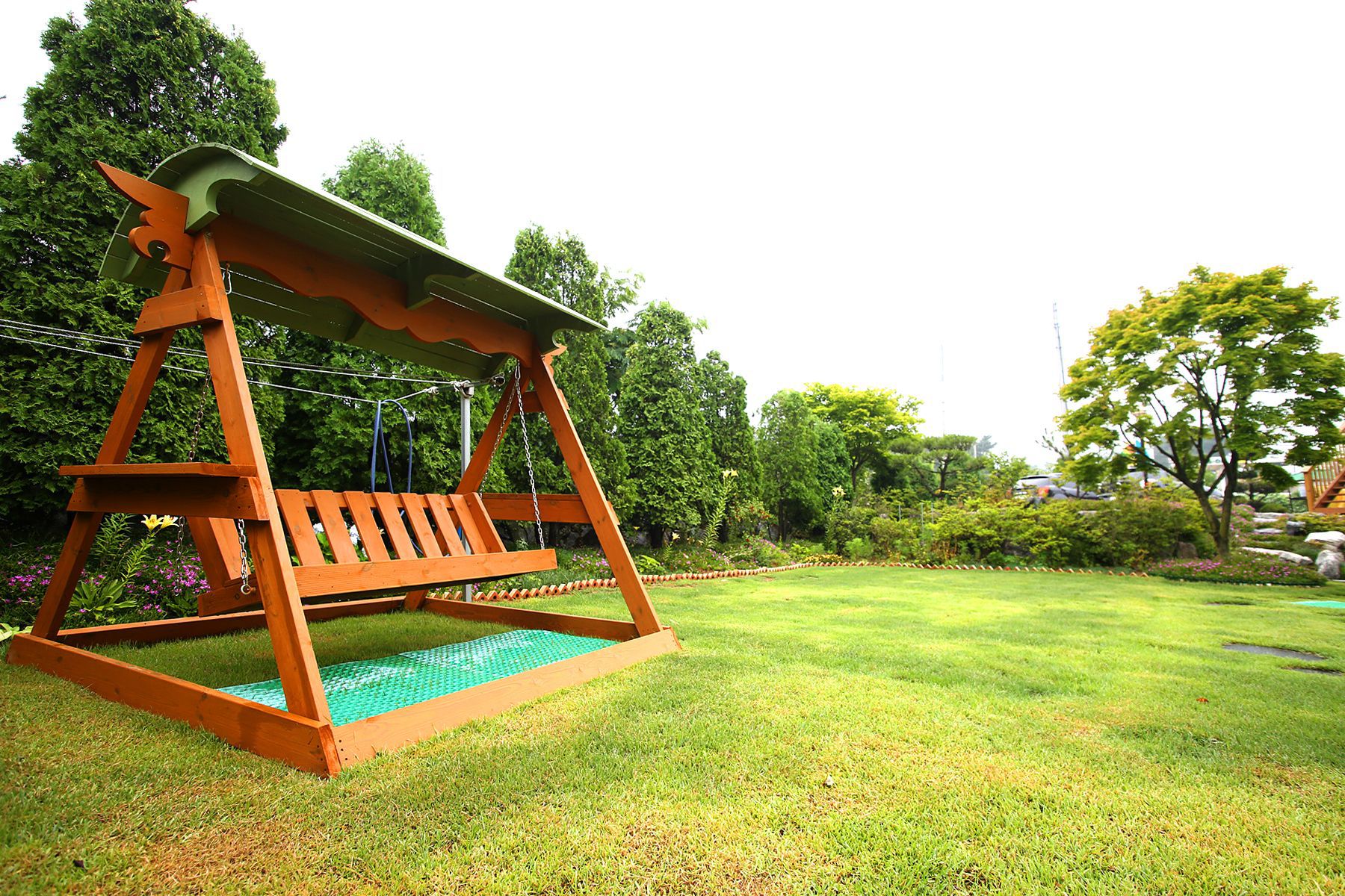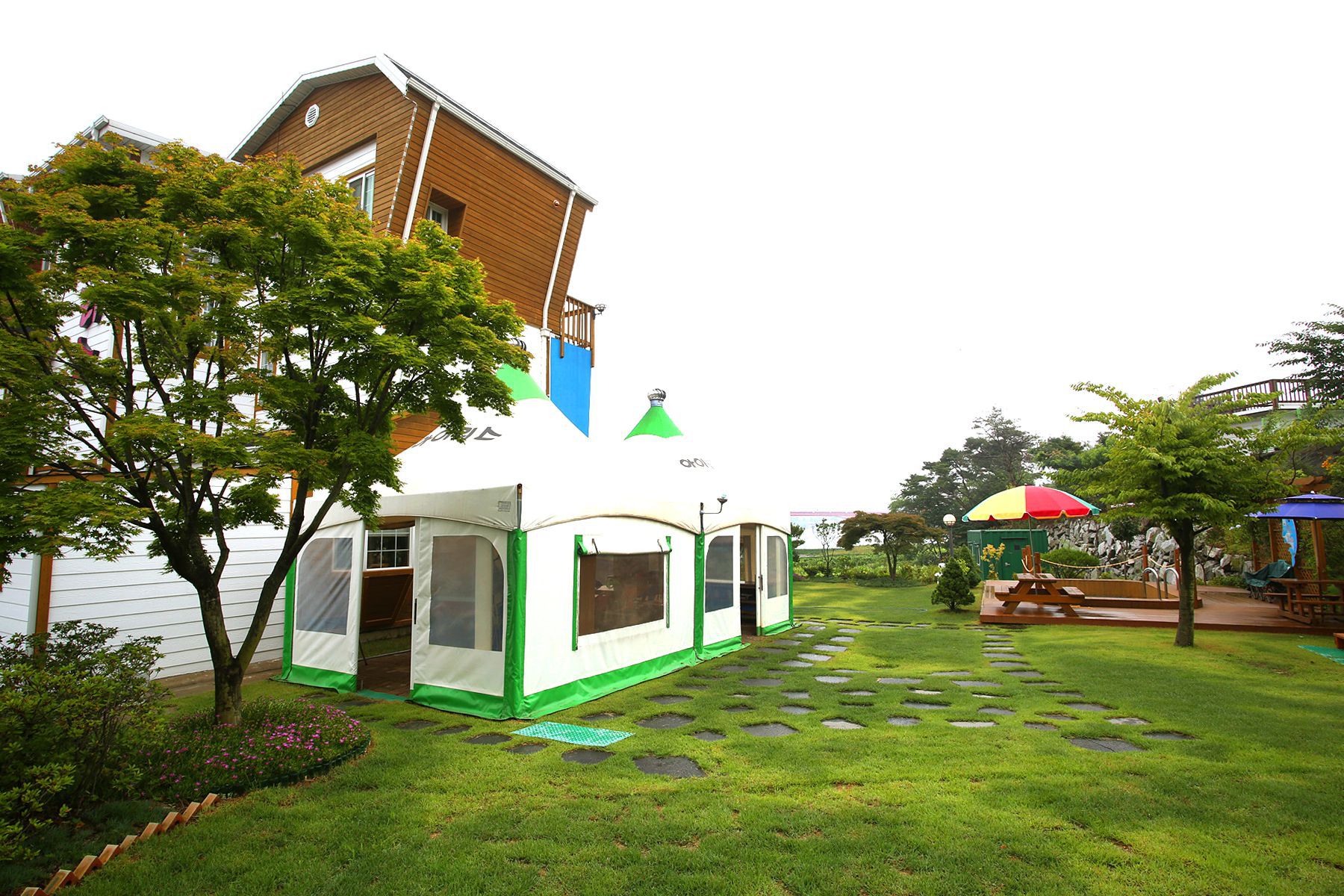 펜션 앞마당에 푸른 잔디가 넓게 펼쳐져 있어 도심에서는 쉽게 만나지 못하는 자연잔디를 원없이 밟으실 수 있으며