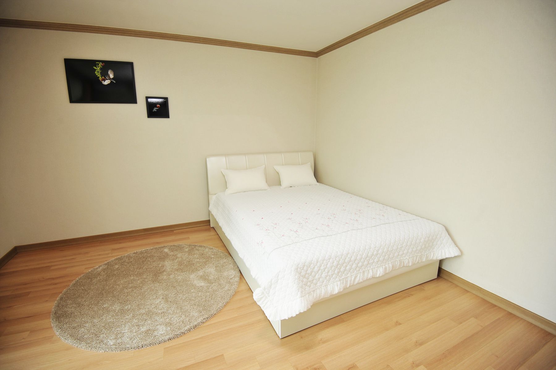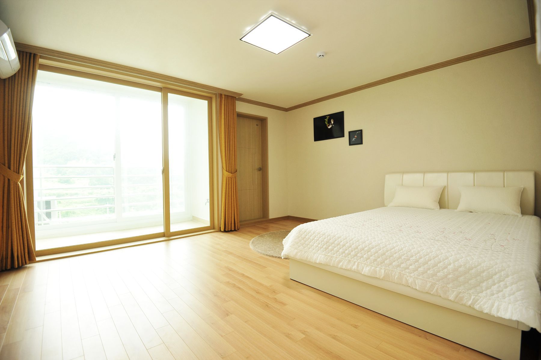 커다란 창문으로 밝게 들어오는 볕이 따사로운 침실입니다.