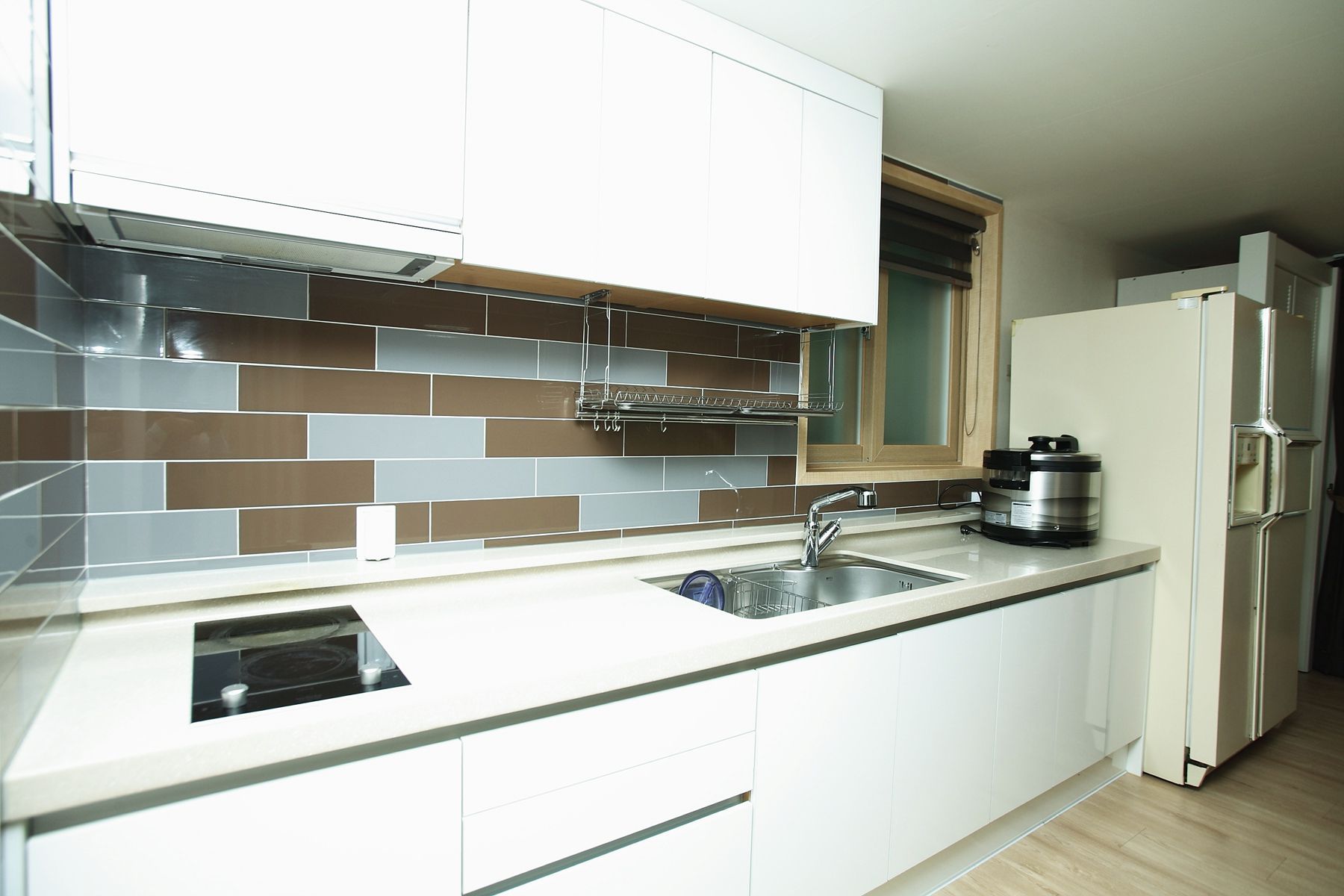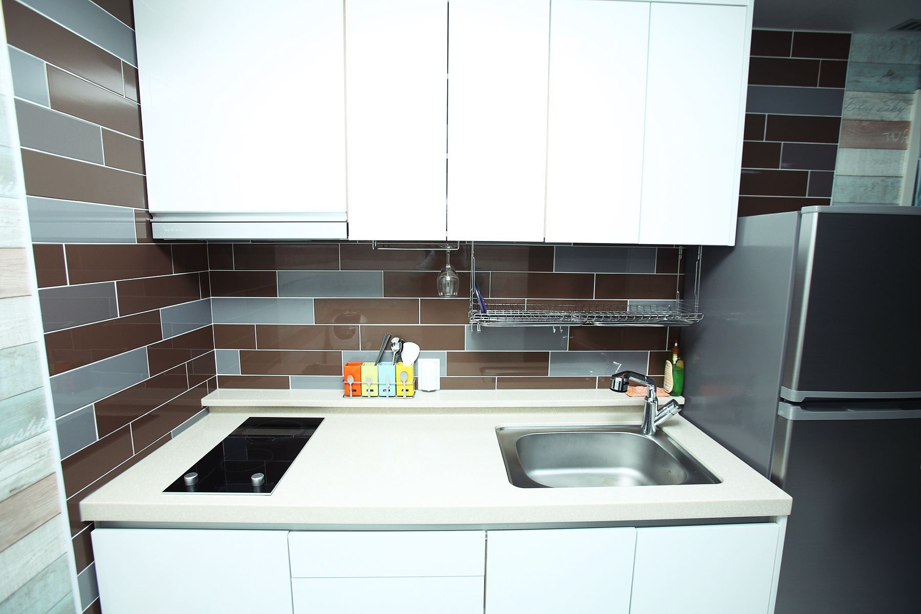 주방에는 여러사람이 이용하기 편하게 수저, 냄비, 식기류등이 다양하게 종류별로 잘 정돈되어 있으며