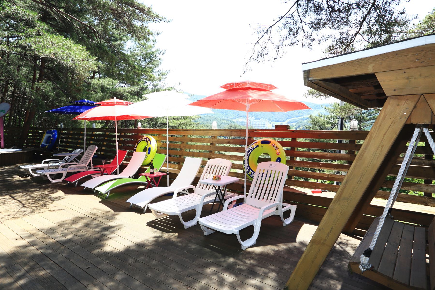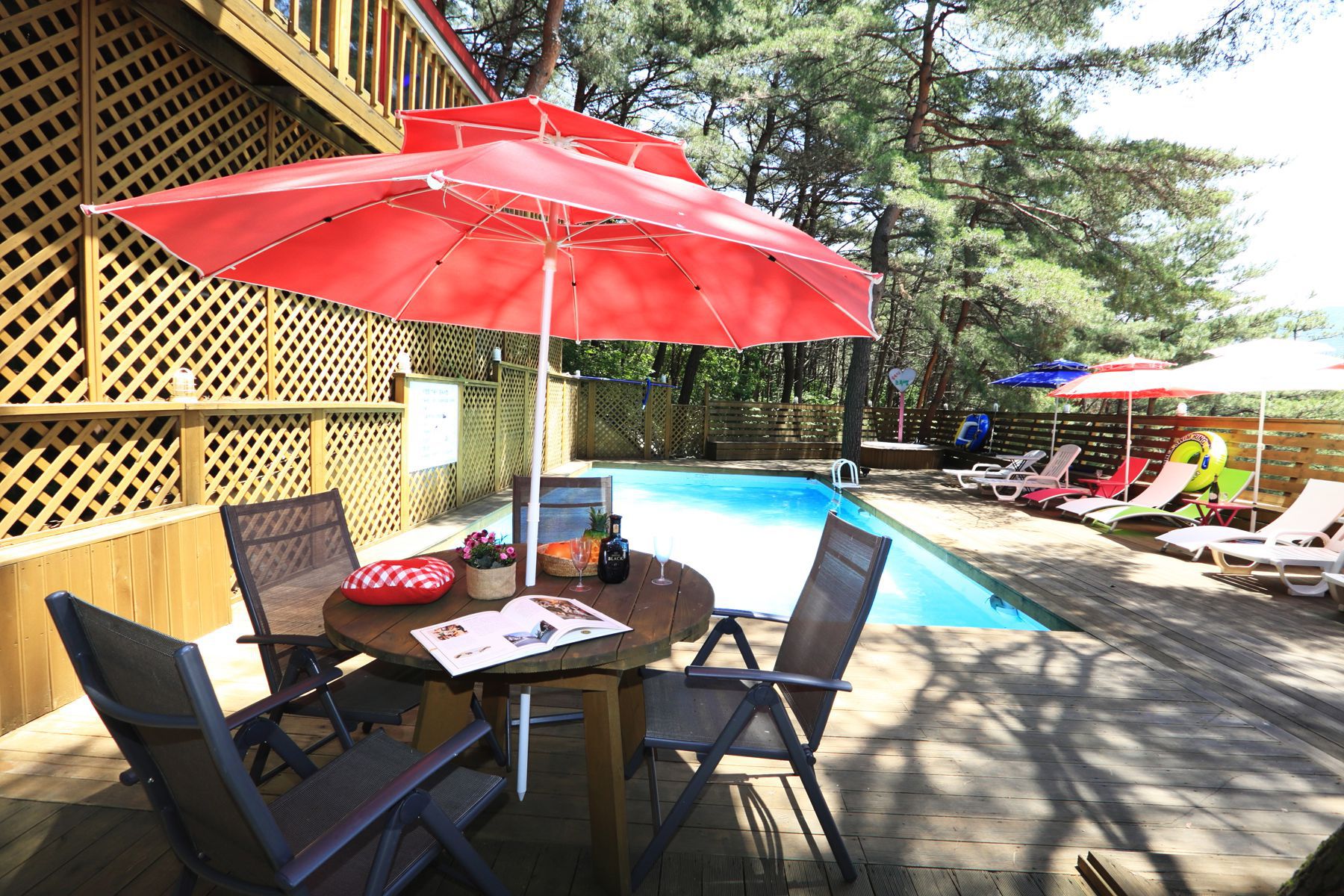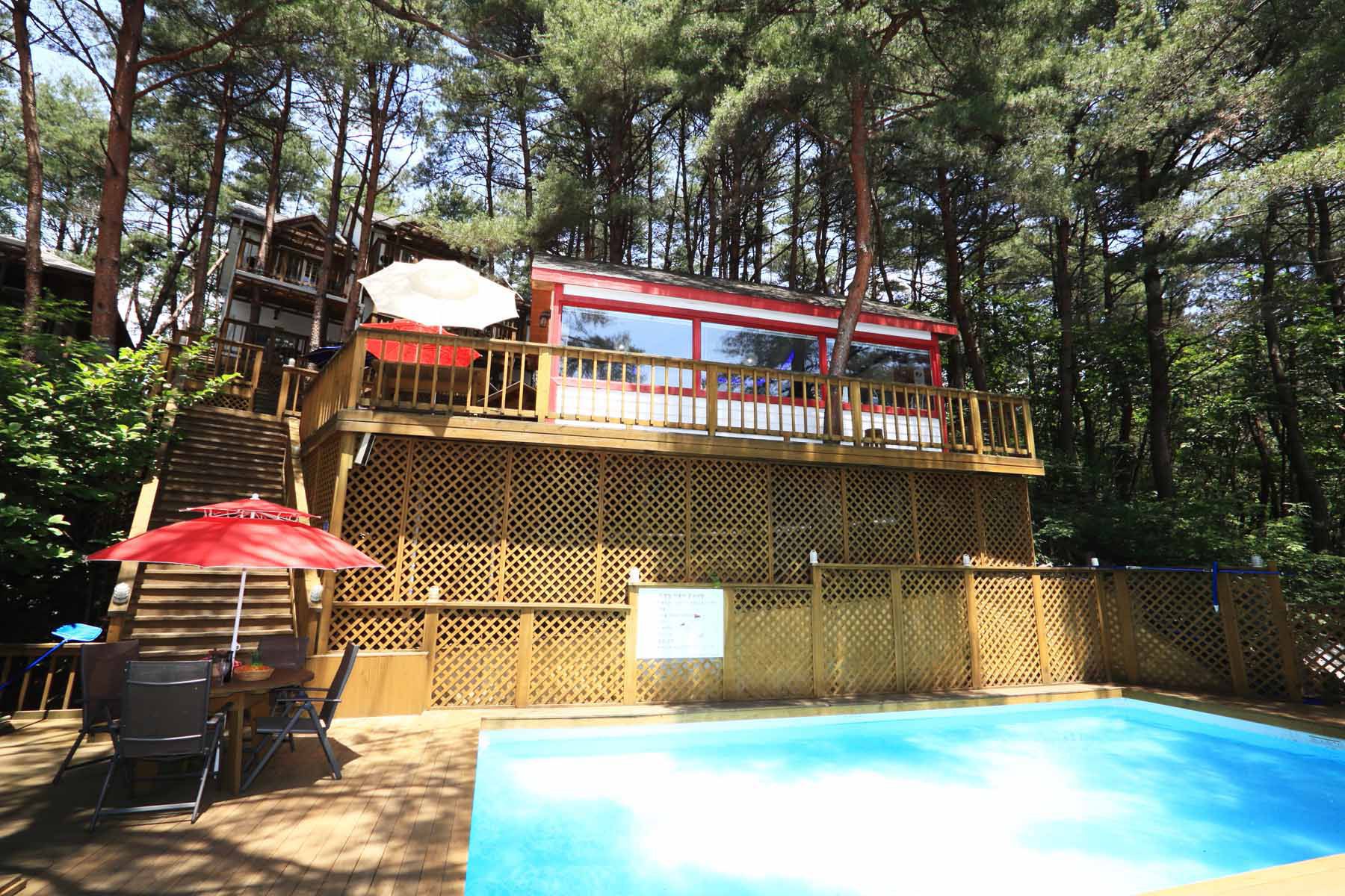 그리고 소나무 숲에 자리한 웰빙풀장에서 무더운 여름을 시원하고 건강하게 보낼 수 있으며 썬배드와 튜브가 비치되어