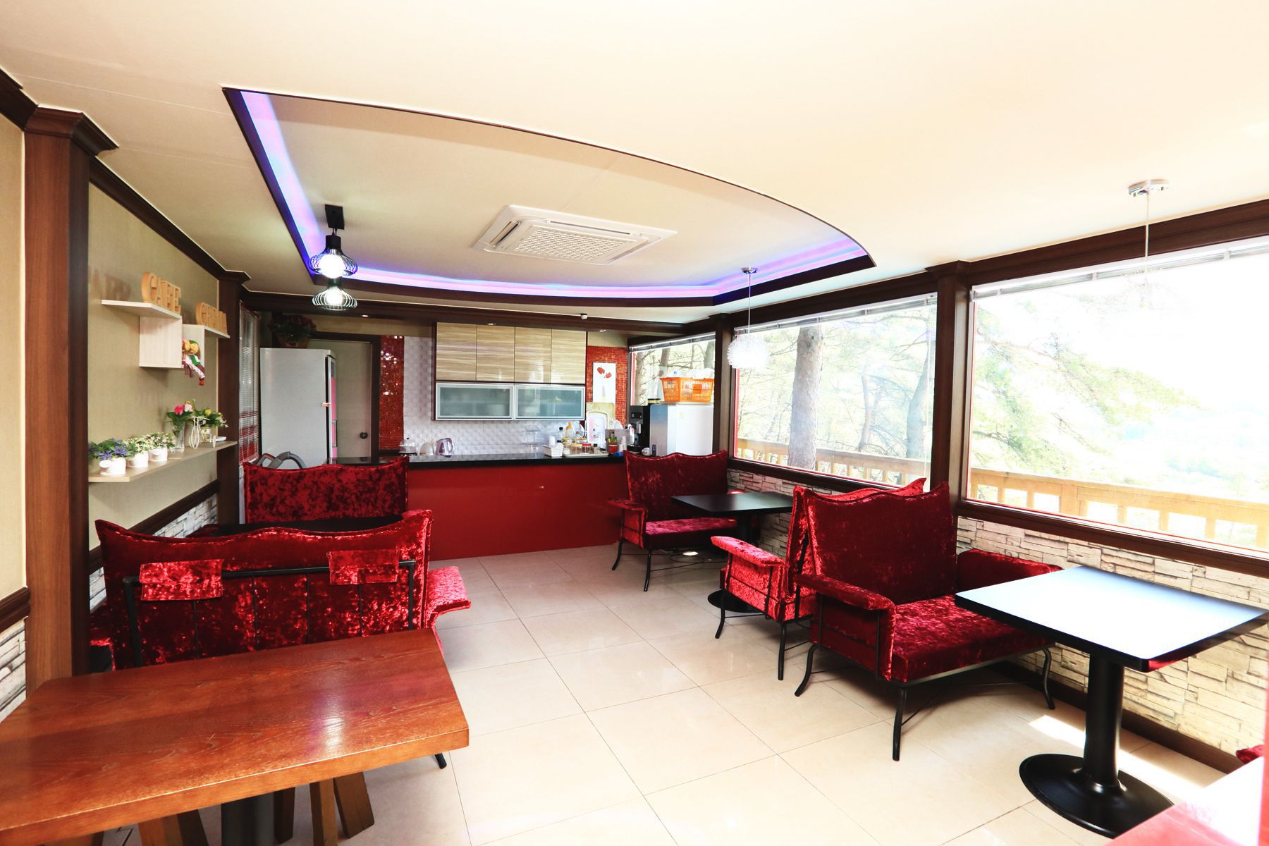 넓은 통창으로 수영장이 내려다보이고 탁 트인 전망을 자랑하는 초록별카페에는