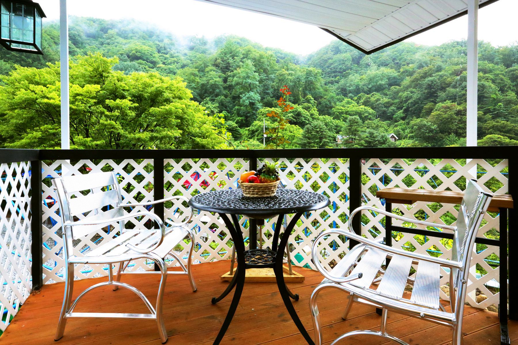 객실발코니에 마련된 테이블에서 피톤치드를 가득 내뿜고 있는 푸른숲을 바라보고 있자면