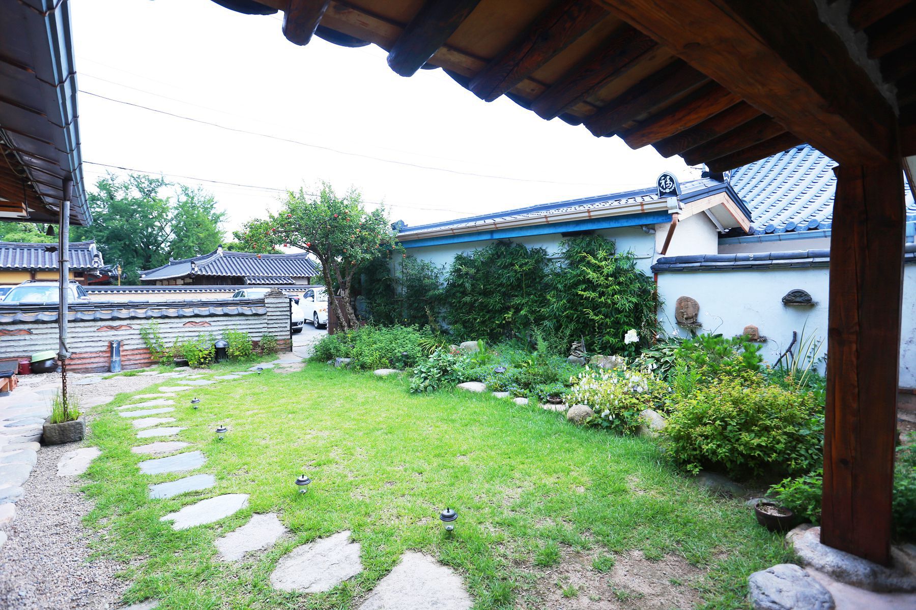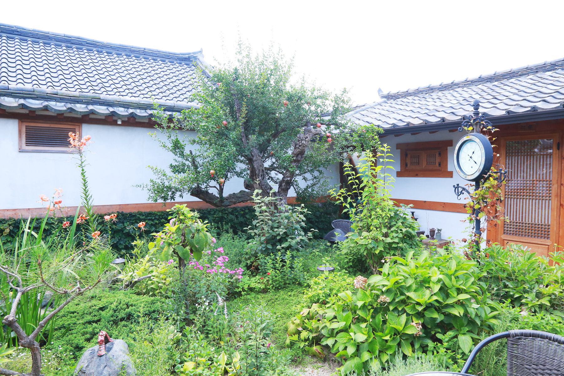 마당 건너편 숭혜전의 돌담과 기와지붕의 고아한선을 감상할수 있으며 마당 한쪽에 자리한 늙은 석류나무가 풍경에 운치를 더하고 있습니다.