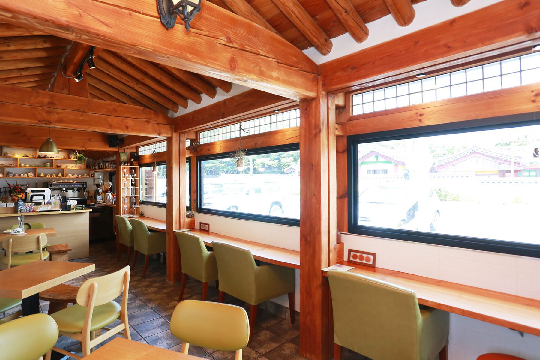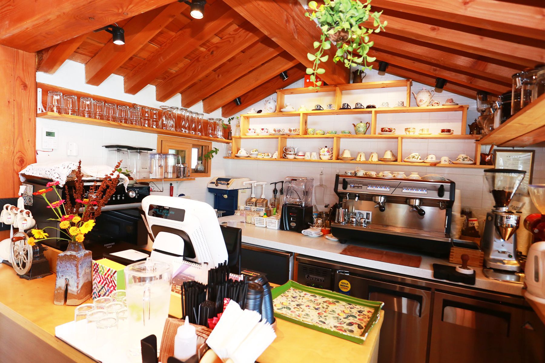 서까래가 드러난 천장 아래 작은 공간을 소박하고 아늑하게 꾸며진 카페는