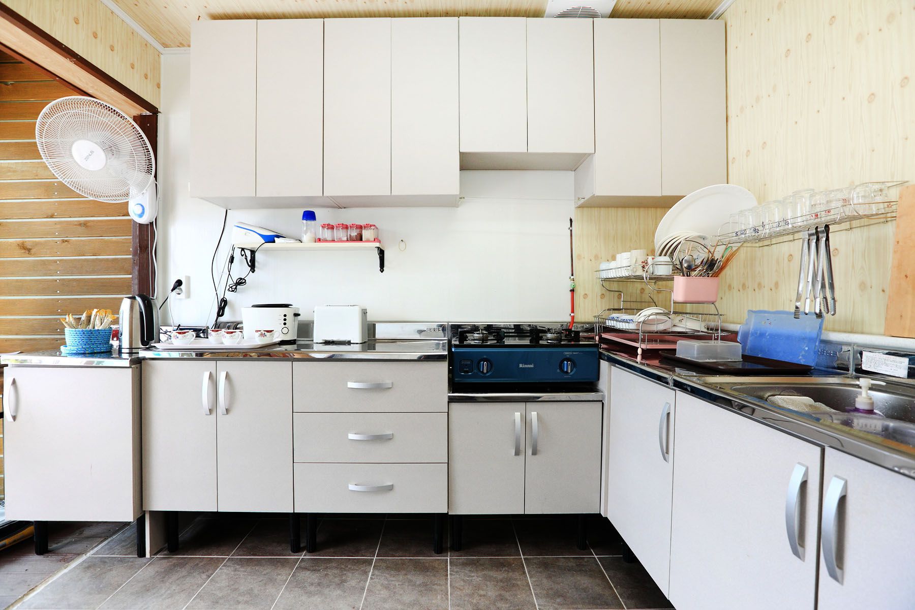 깔끔한 주방에는 토스트,커피,라면이 항상 구비되어
