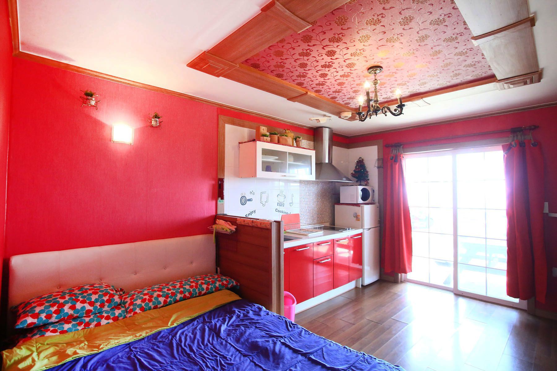 전체적인 레드빛에 블루색 침구류로 한껏 멋을낸 이곳은 102호로