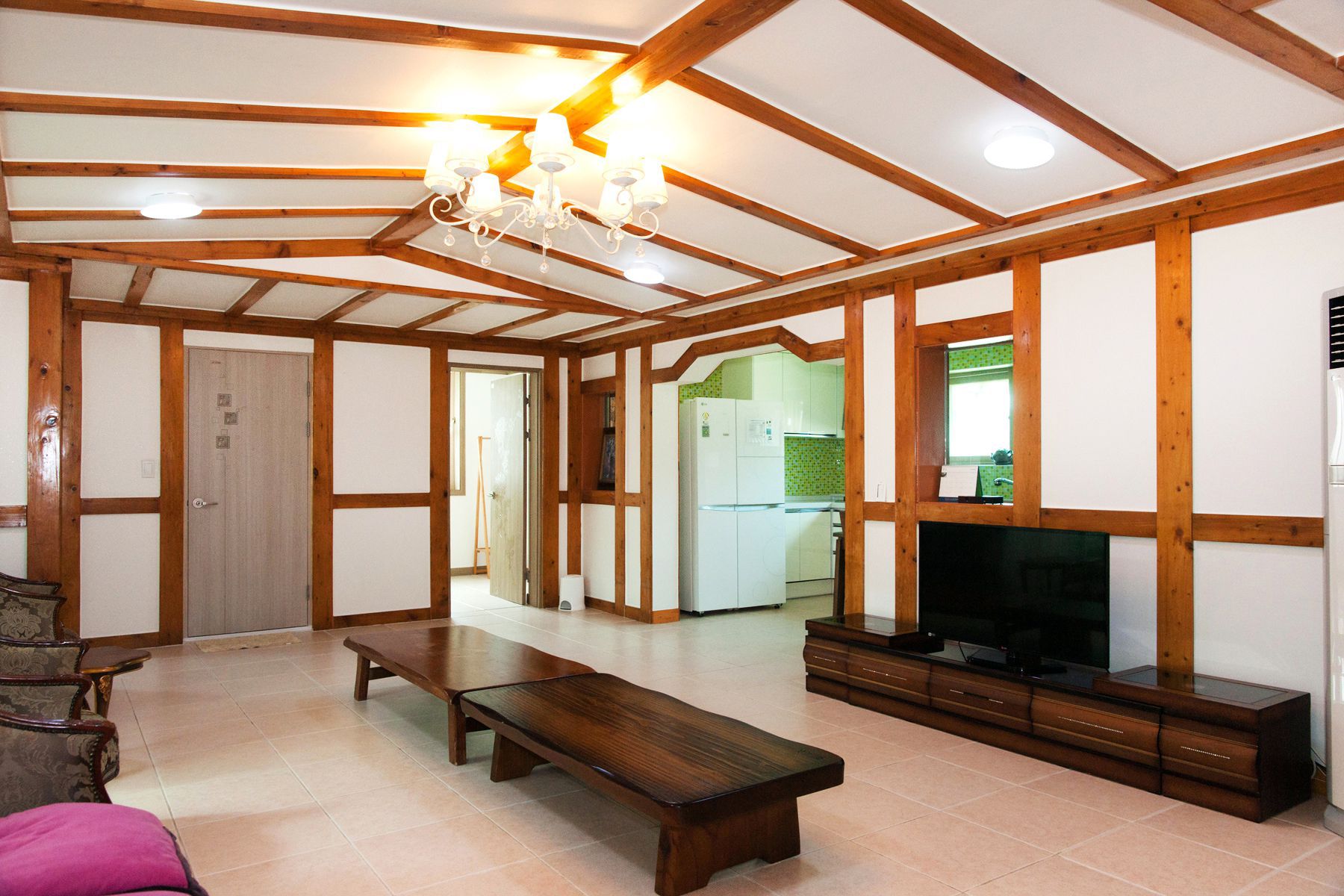 힐링관에는 큰거실,룸3개,벽걸이tv,에어컨,쇼파,식탁,주방기기,정수기,세탁기,화장실2개로 구성되어 있습니다.