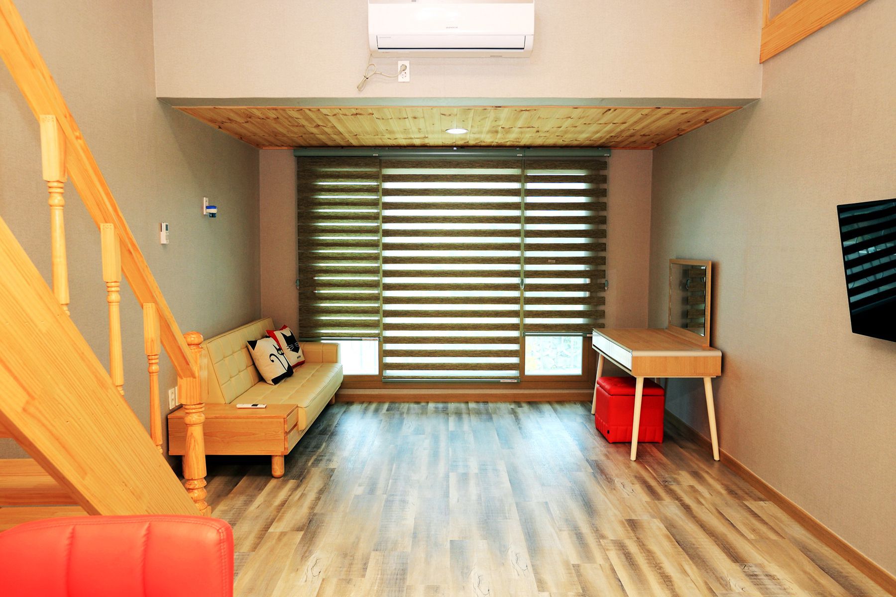 거실에 들어선 순간 깔끔하다라는 느낌을, 복층에 올라간 순간 우와~넓고 아늑하다라는 느낌을 주는 객실입니다.