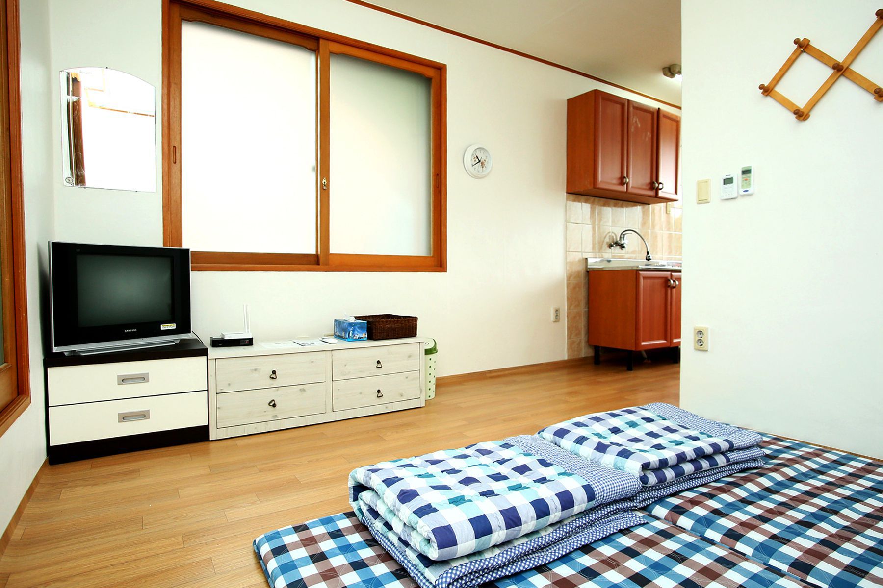 원룸형 구조이지만 방과 주방겸거실 공간이 구분되어 있어 편리하고 전자렌지,밥솥,커피포트,취사도구,tv,에어컨 등이 구비되어 있습니다.