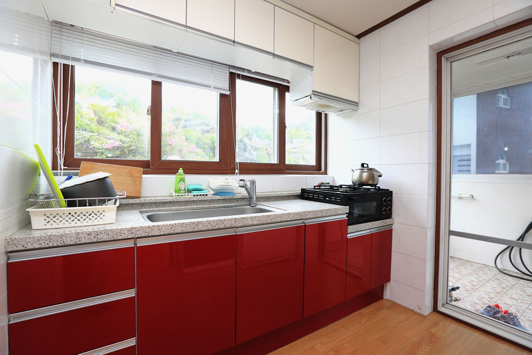 넓고 깔끔한 주방은 화이트앤 레드로 포인트를 주었고