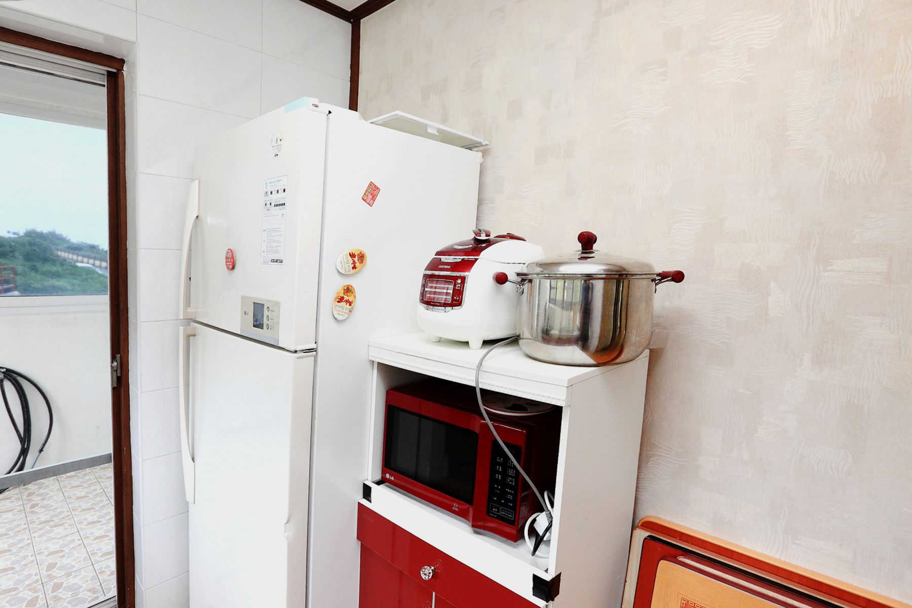 대형냉장고와 필요한 주방도구가 모두 구비되어 있어서 단체로