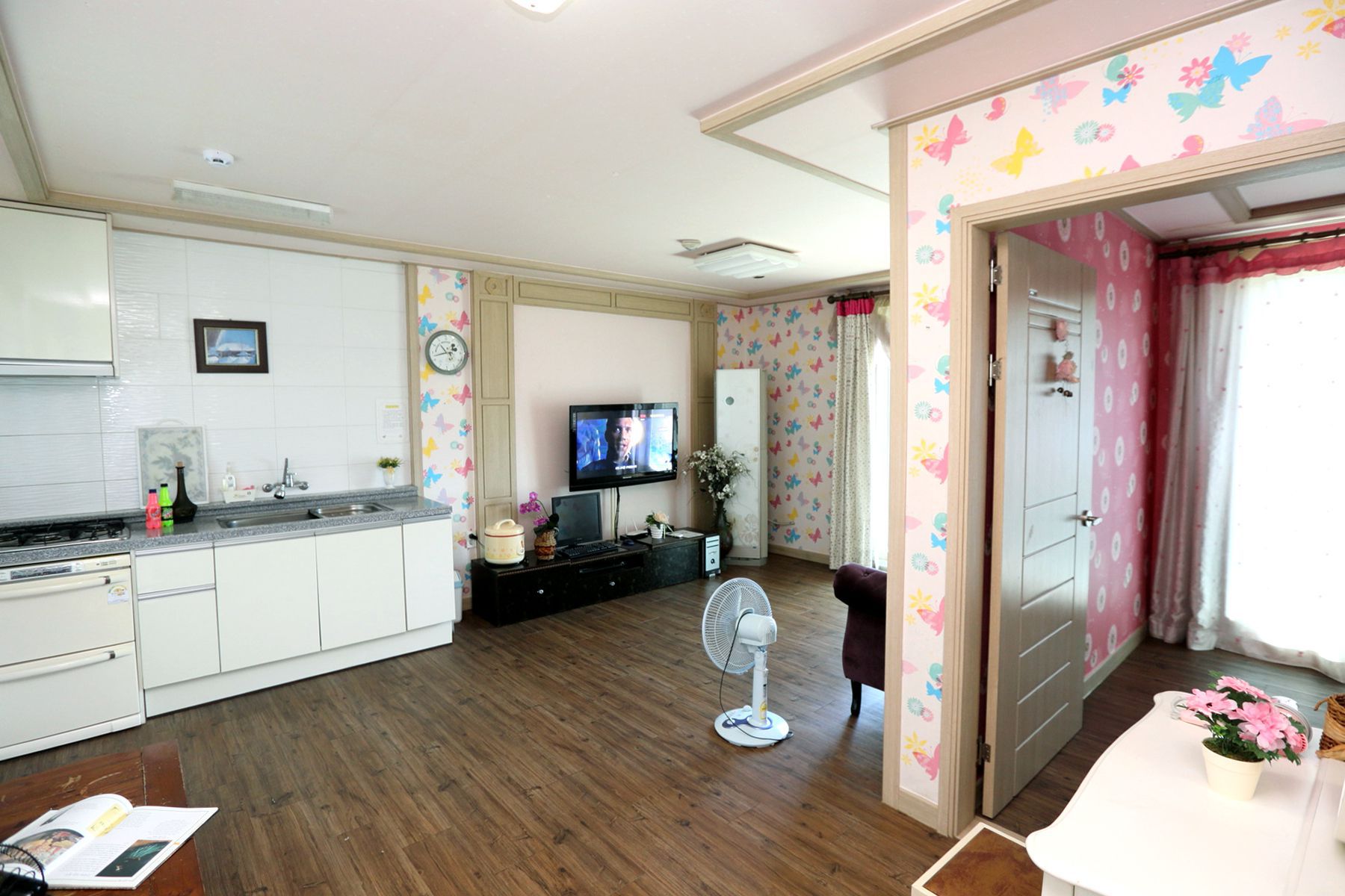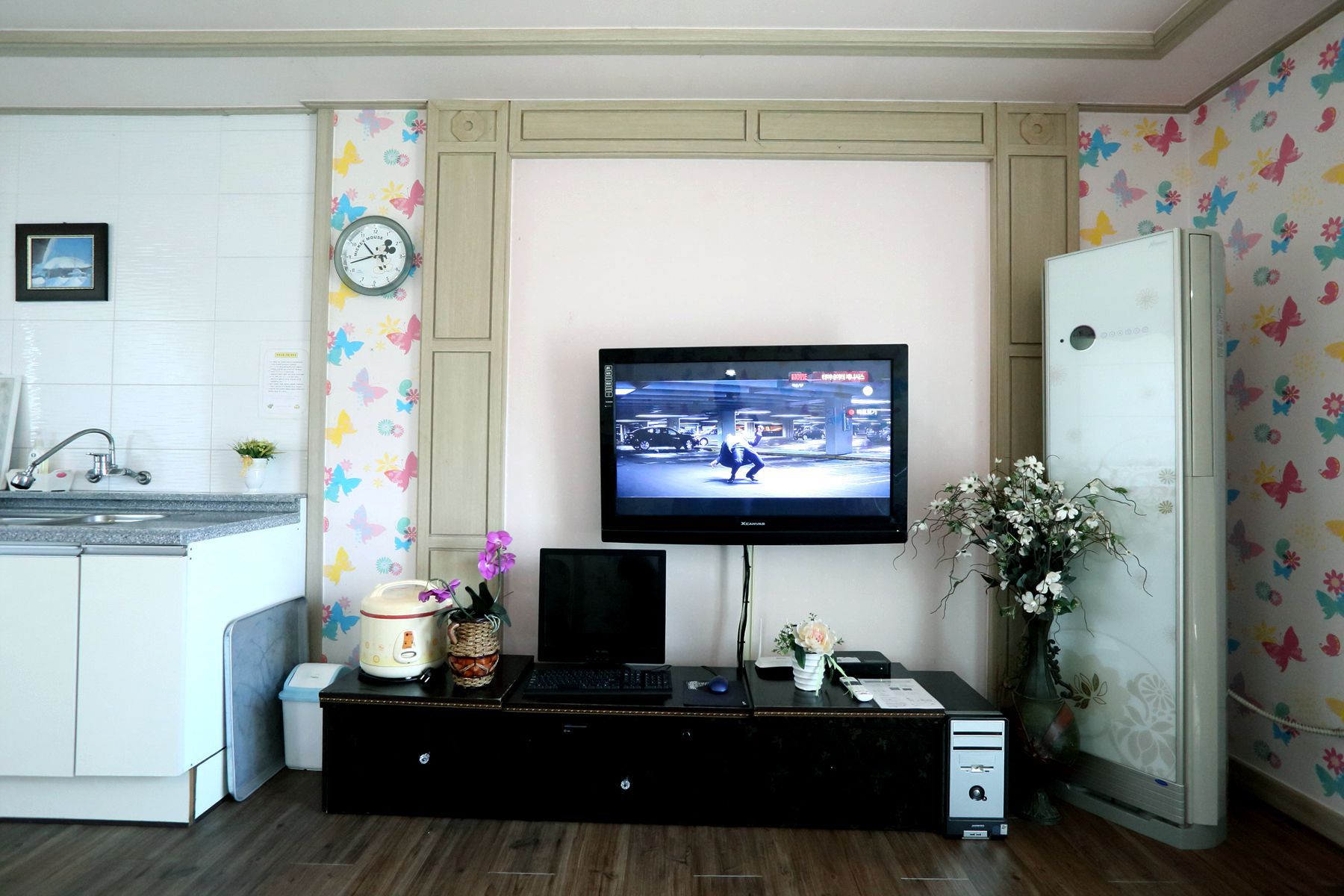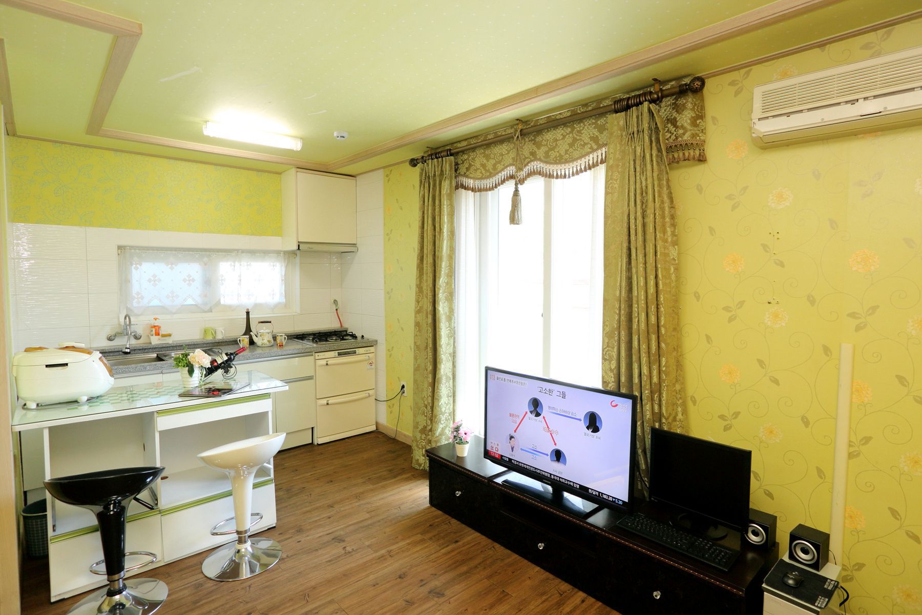 모든 객실에는 티비,에어컨,화장대,시계,노트북,선풍기등