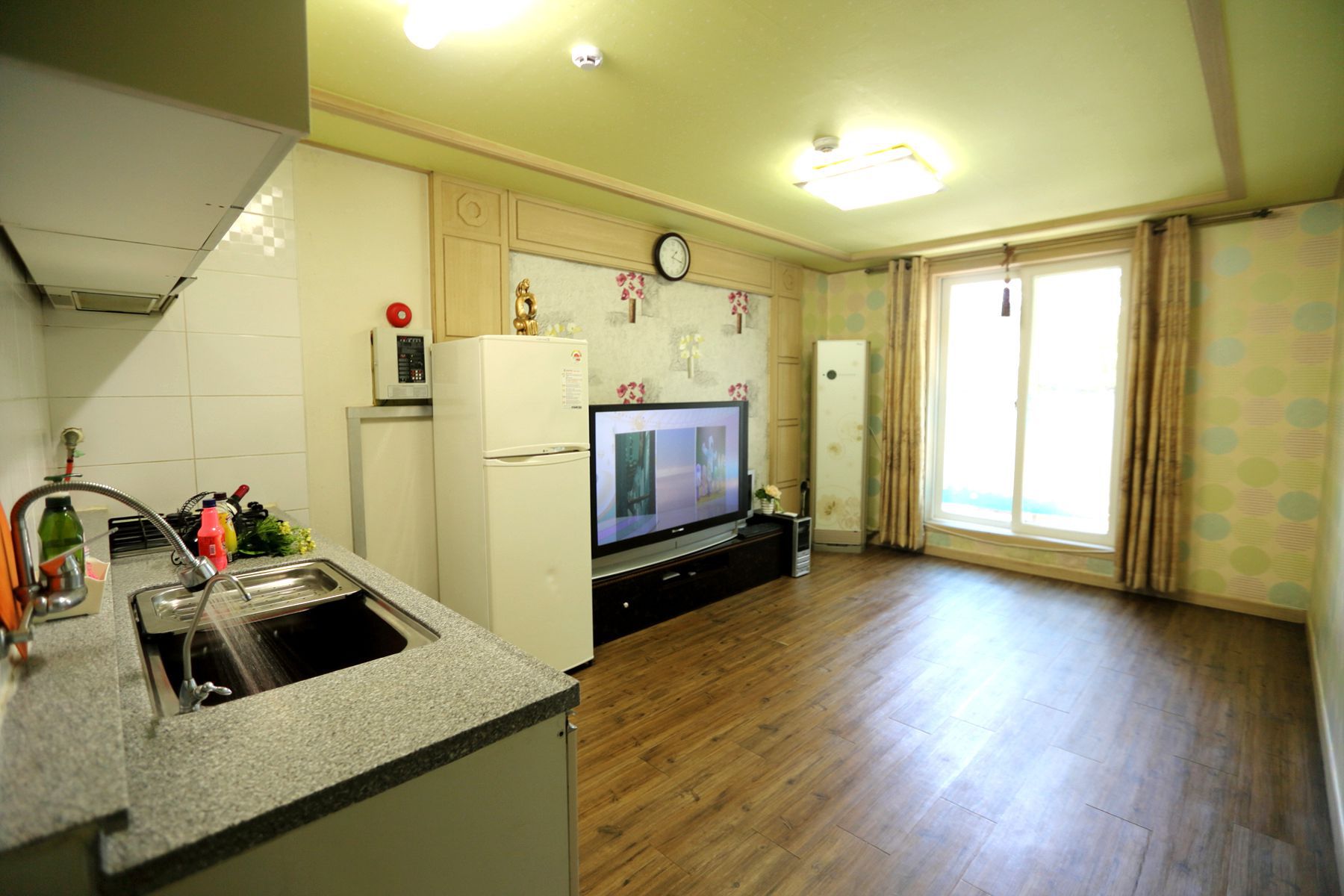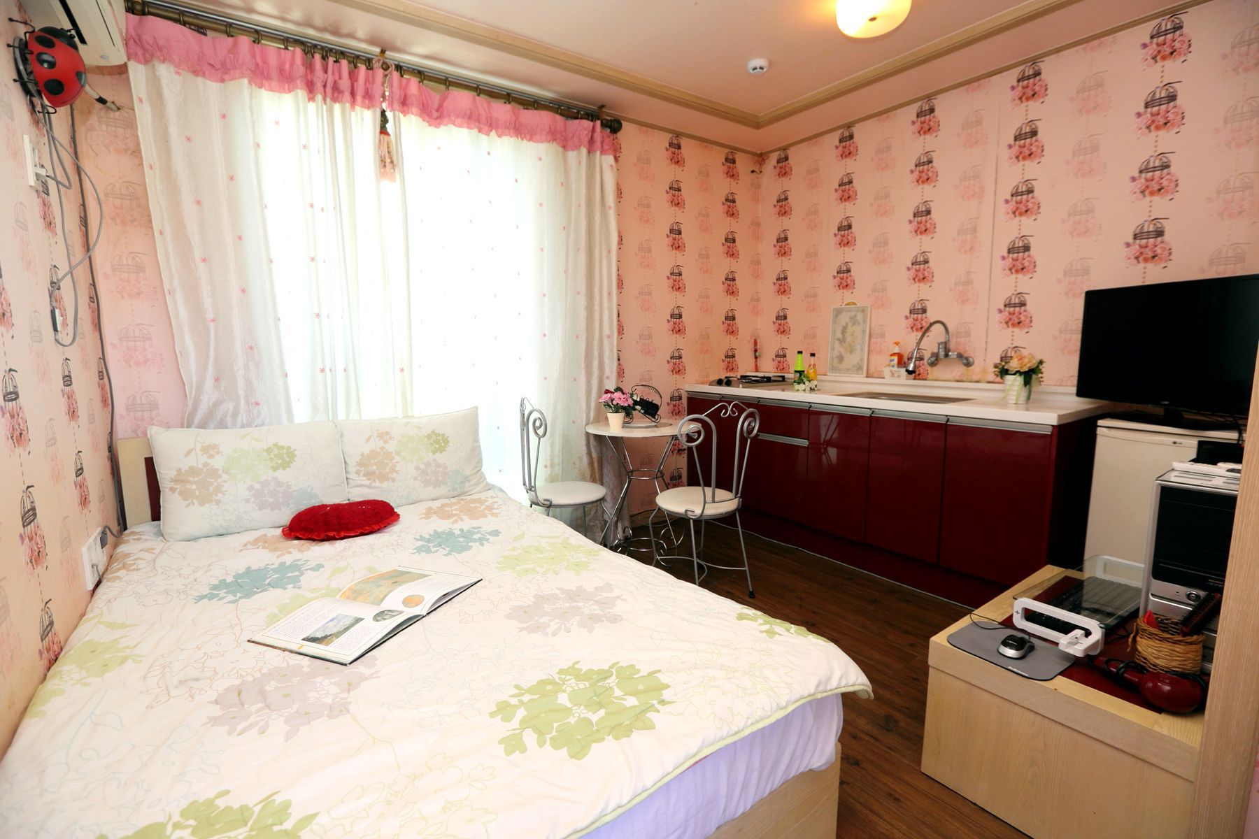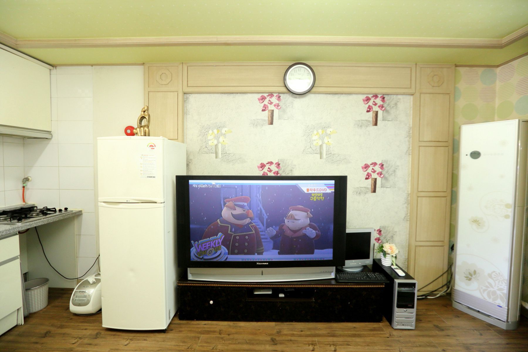 모든 객실에는 티비,에어컨,화장대,시계,노트북,선풍기등