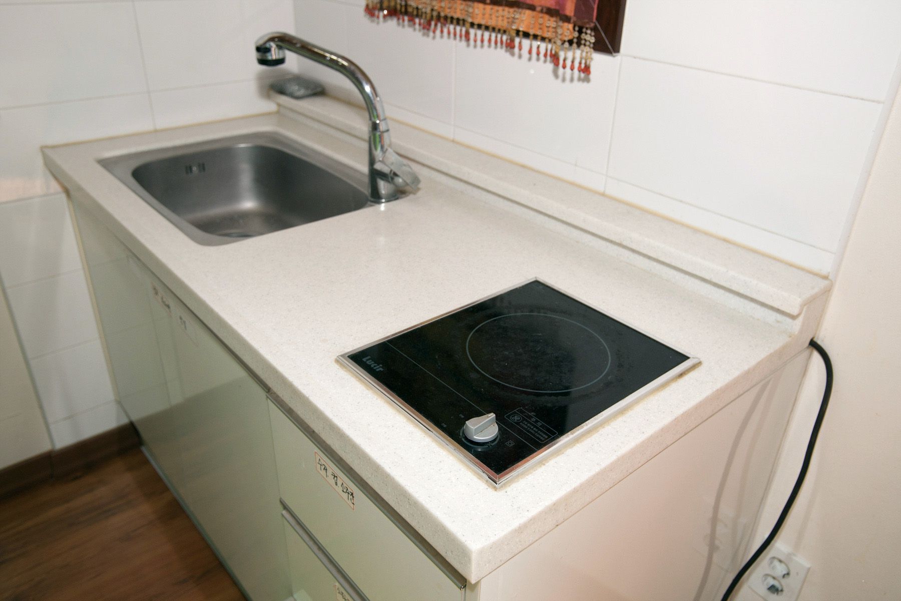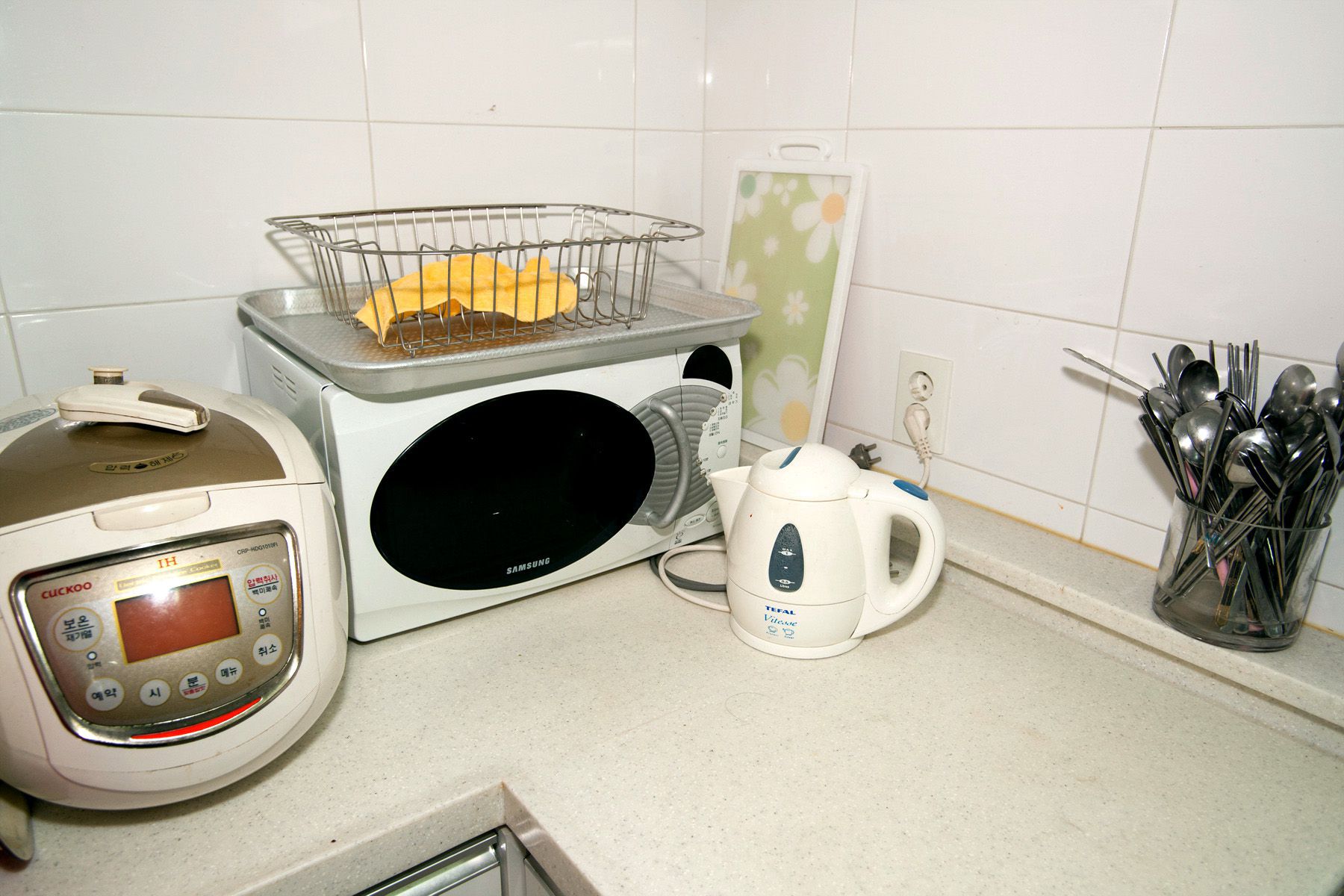 전기밥솥, 커피포트, 전자레인지, 식기류, 냄비류, 조리도구등 여러종류의 주방용품들이 골고루 갖추어져 있어