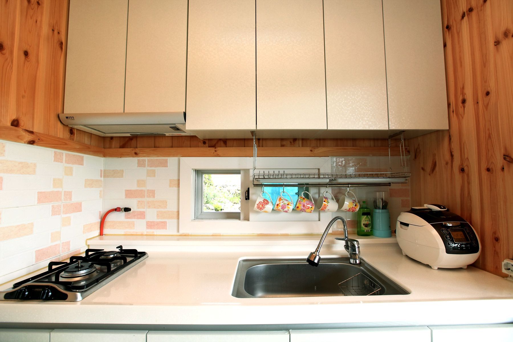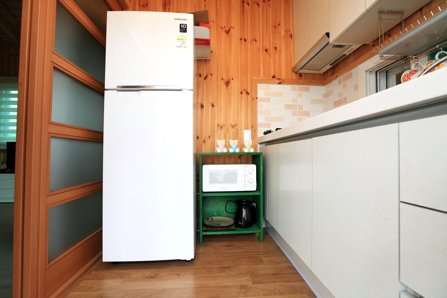 넓고 깔끔한 주방에 마련된 전자렌즈, 밥솥,대형냉장고, 식기류등은
