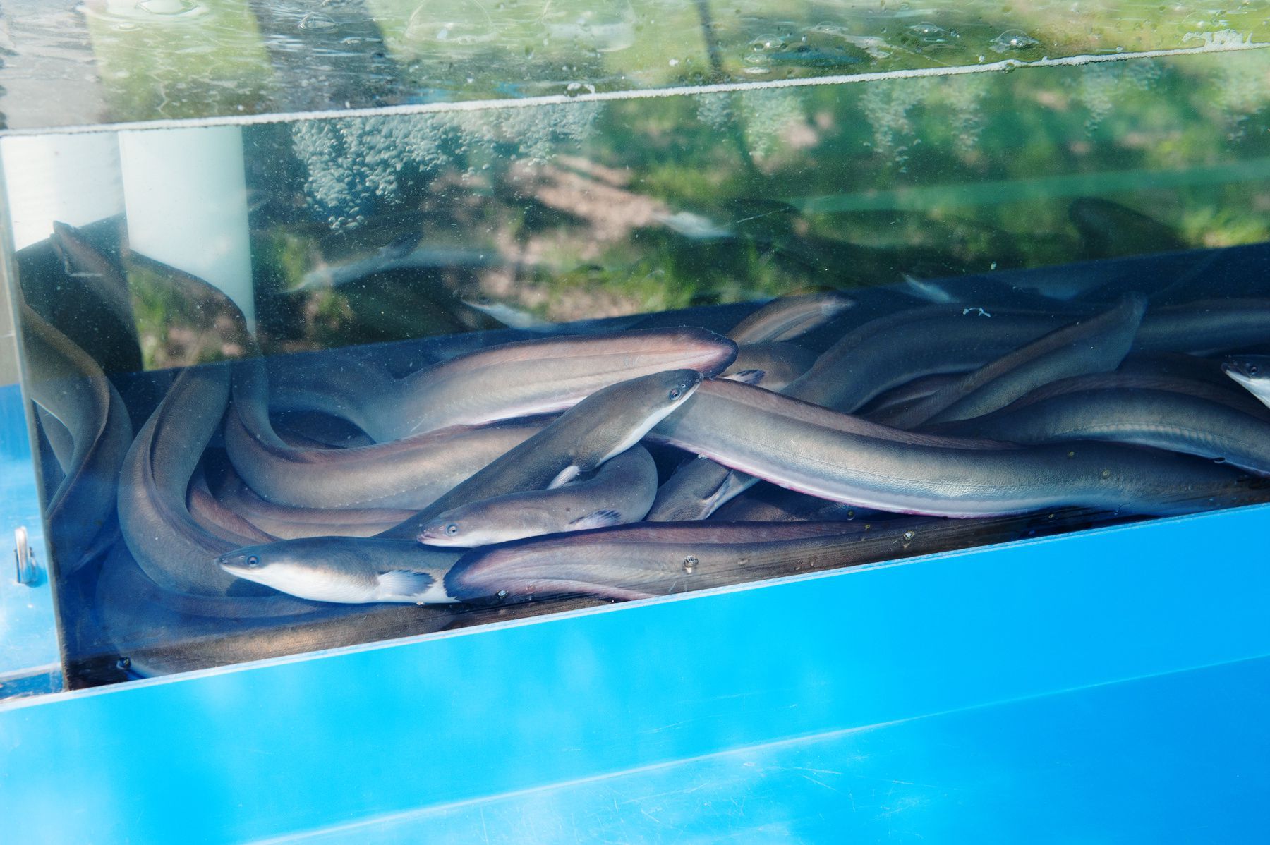 깨끗하게 잘 관리되어 있는 수족관에는 수입산 패사장어가 아닌 100% 국내산 1등급의 장어들이