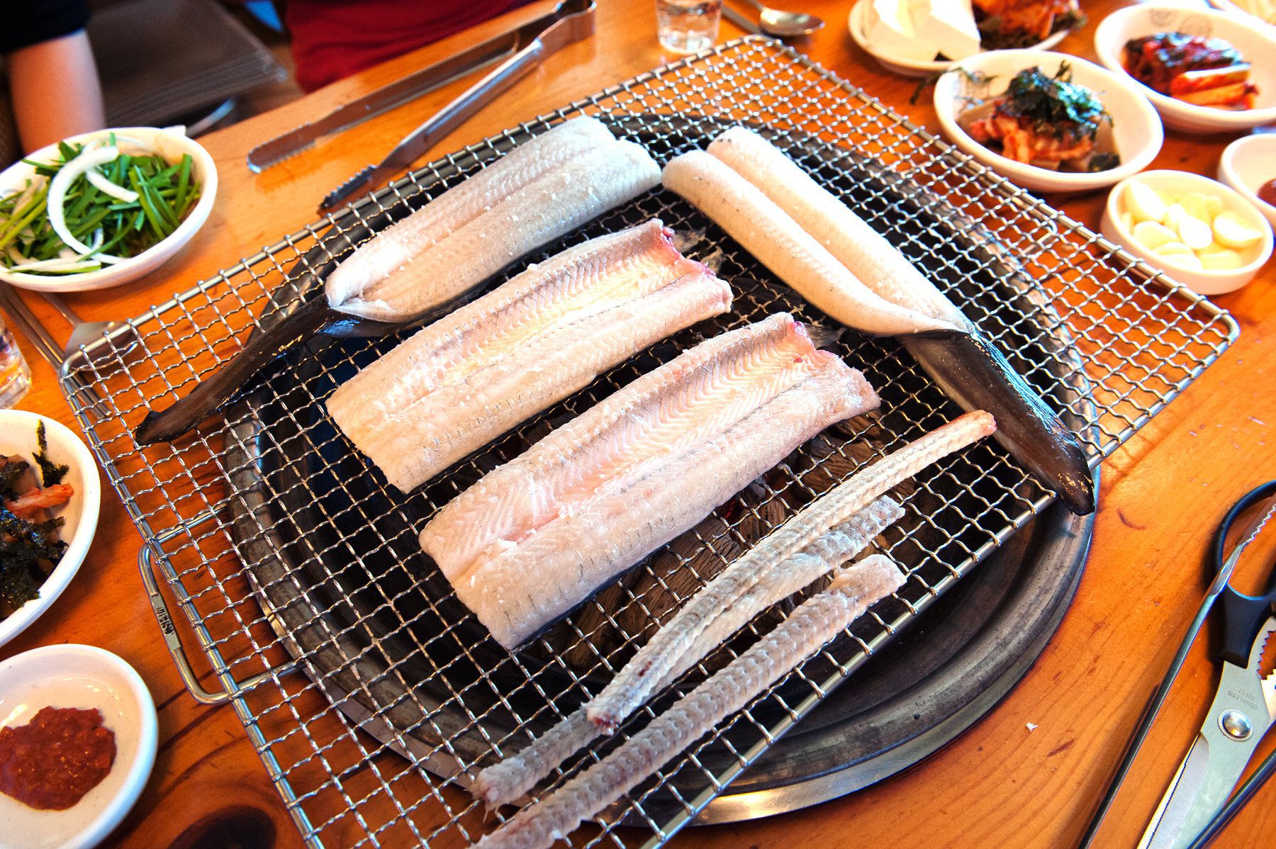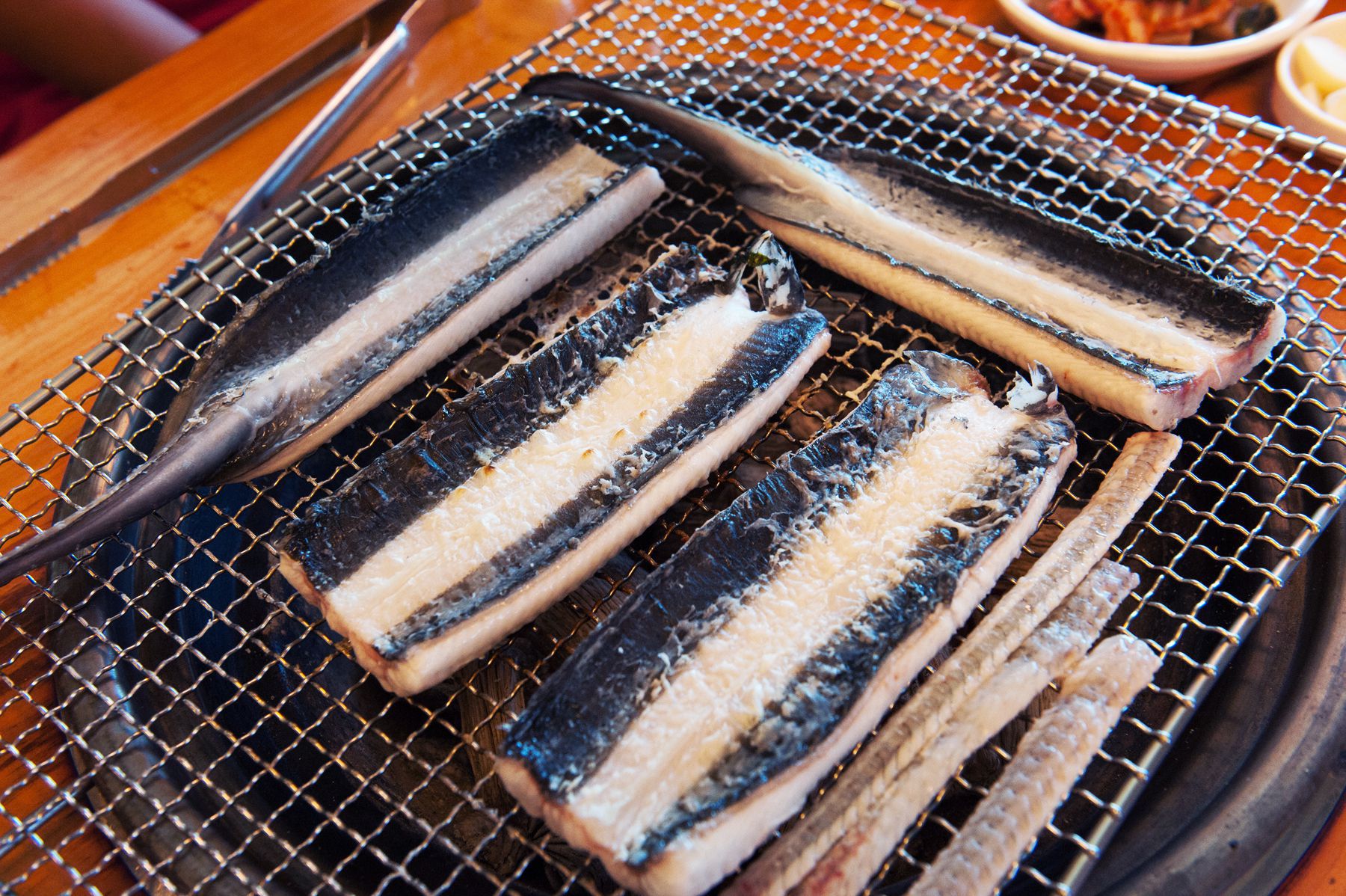 장어살 쪽에 소금을 먼저 뿌린후 불판에 올려 구워 줍니다.
