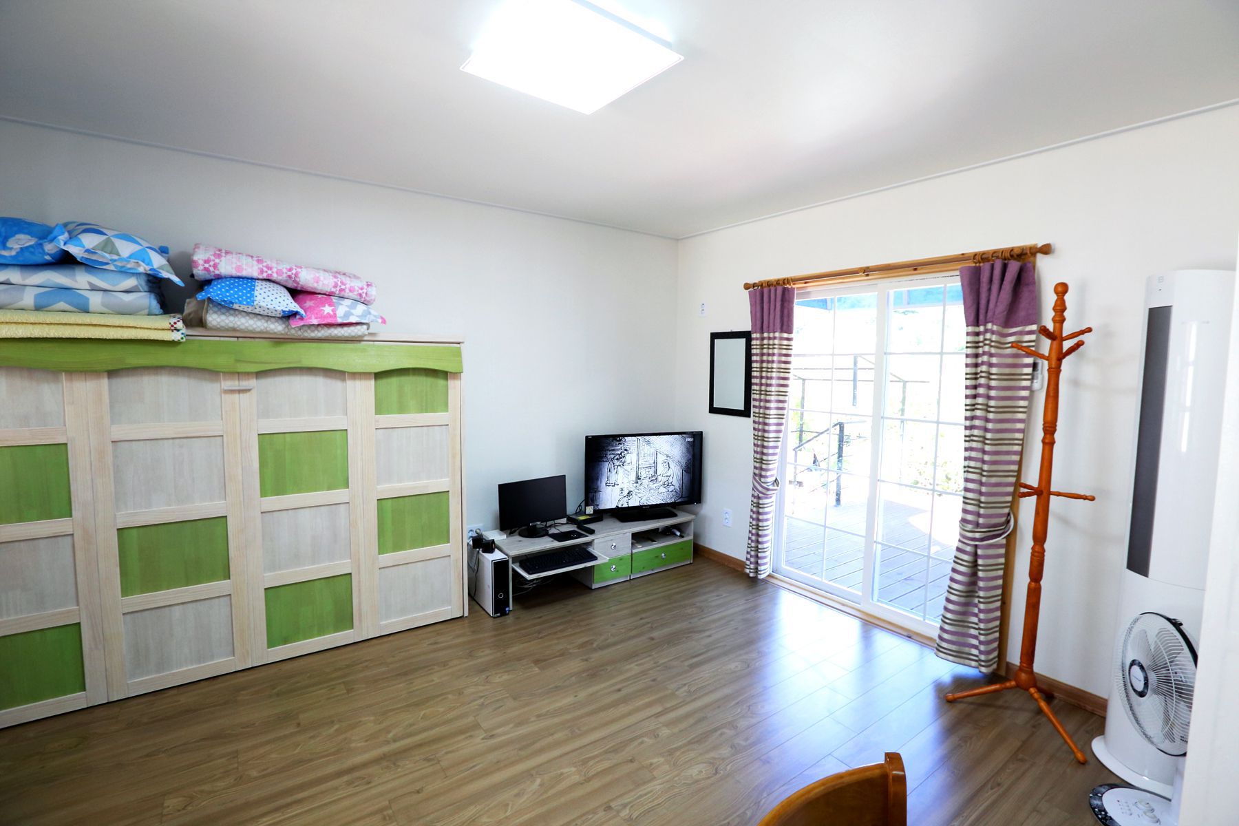 자연을닮은 연두빛 침구류와 식탁,냉장고,주방,에어컨,티비,선풍기등