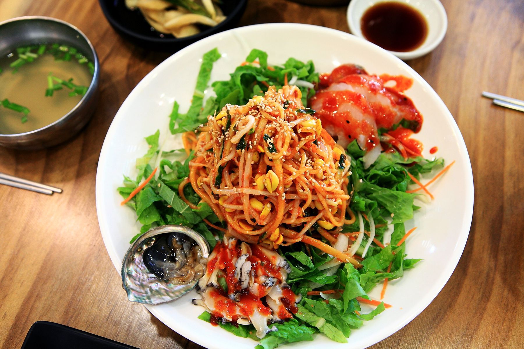 전복과 회는 비빔국수와 함께 드시면 환상의 궁합으로 최고의 맛을 자랑합니다.