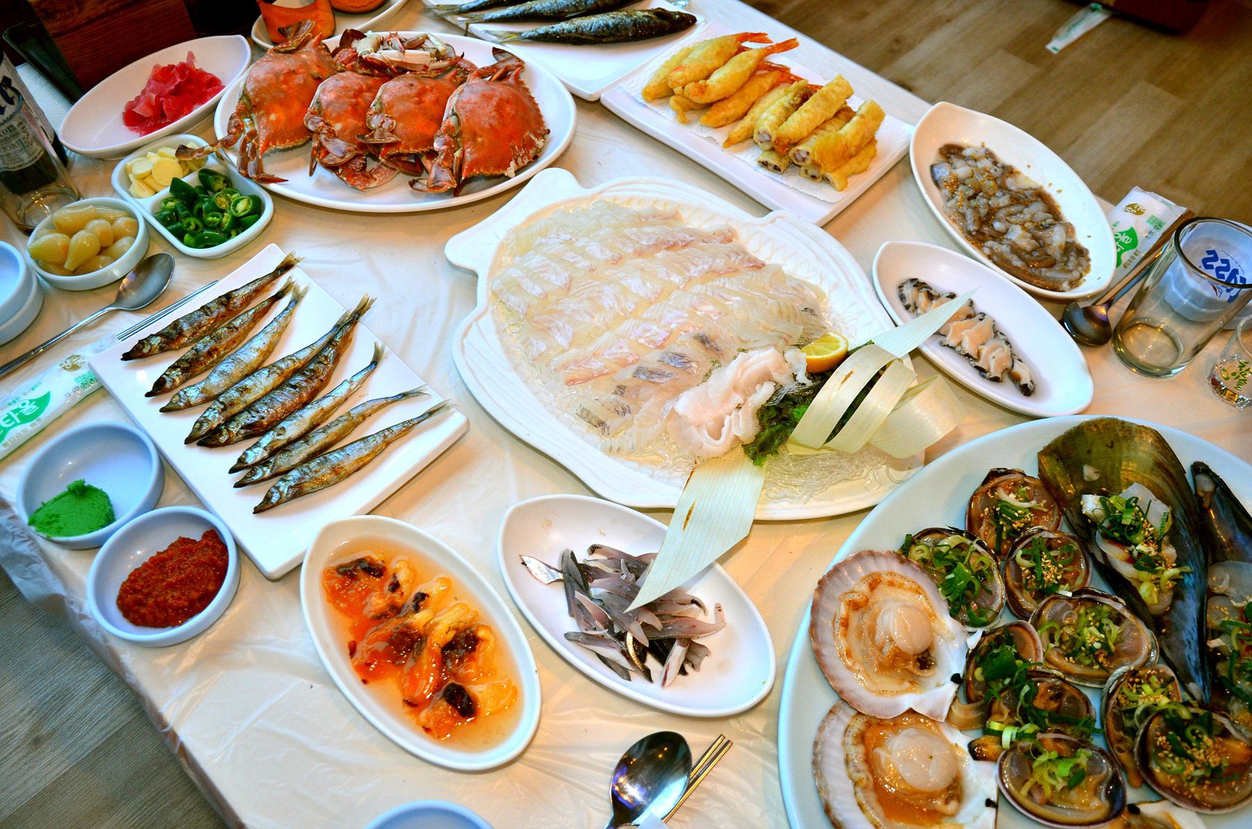 그중에 세트 A메뉴는 회에 꽃게찜, 생선구이, 대하구이, 새우튀김, 굴등 계절에 맞게 다양한 스키다시가 나옵니다.
