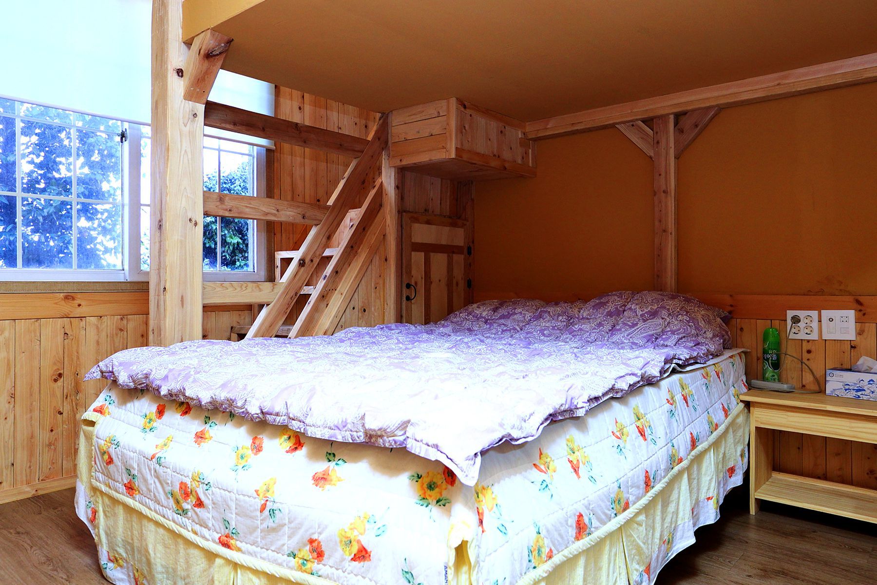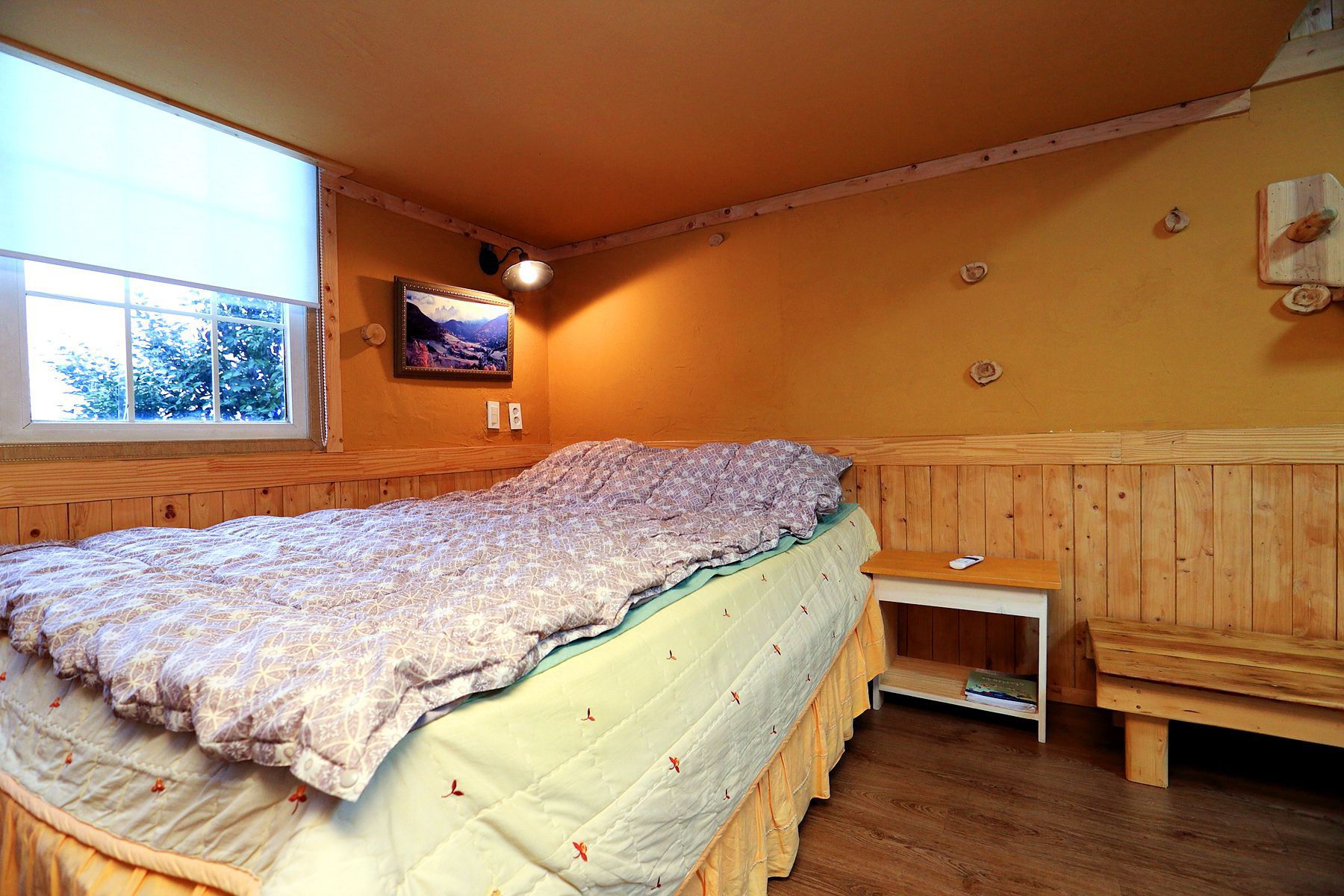화사한 느낌이 드는 이불커버로 방분위기를 밝게 해주어 여름에는 시원하게 겨울에는 따뜻하게 쉬어가실 수 있는 공간으로