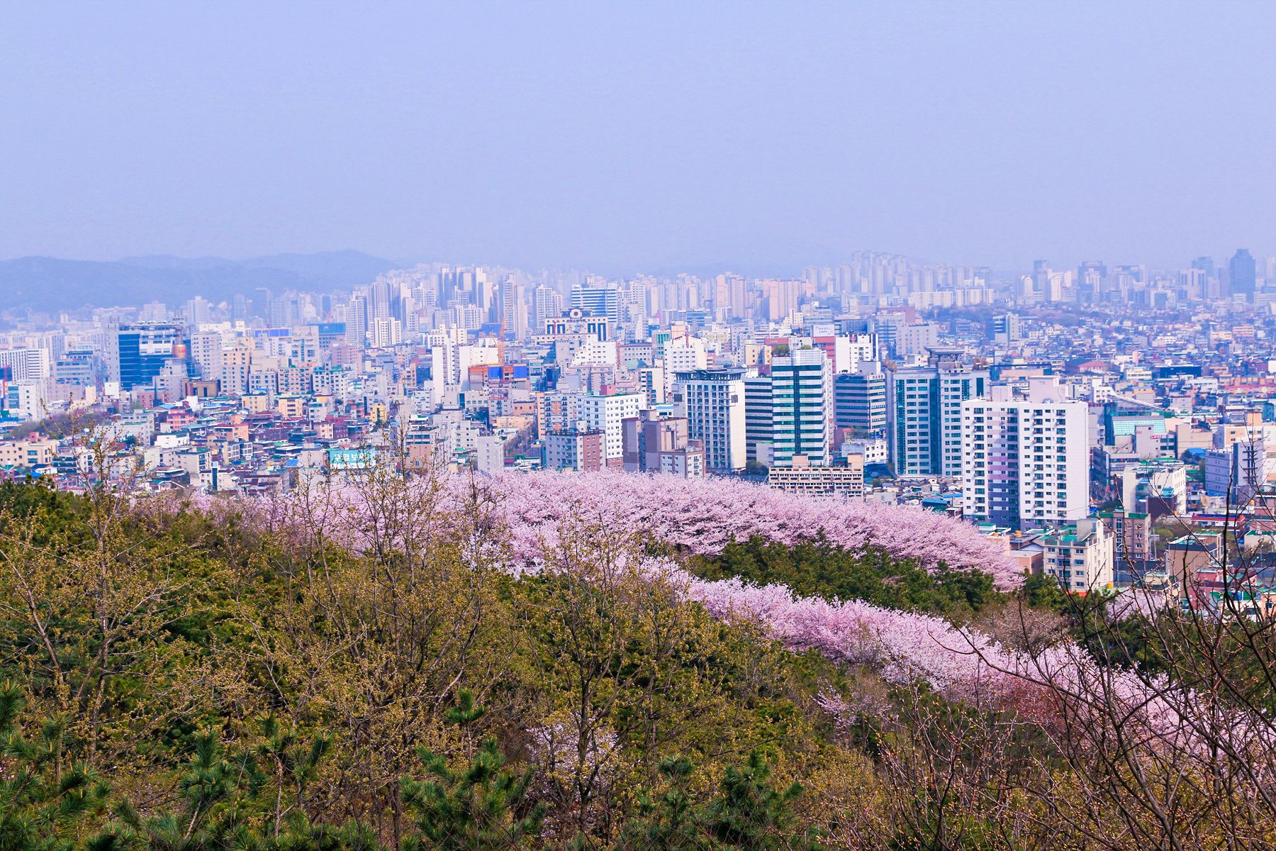 빼곡히 들어선 빌딩들 아래로 산머리위 하얗고 분홍색의 벚꽃들이 활짝 피어 정말 아름다운 모습이랍니다.