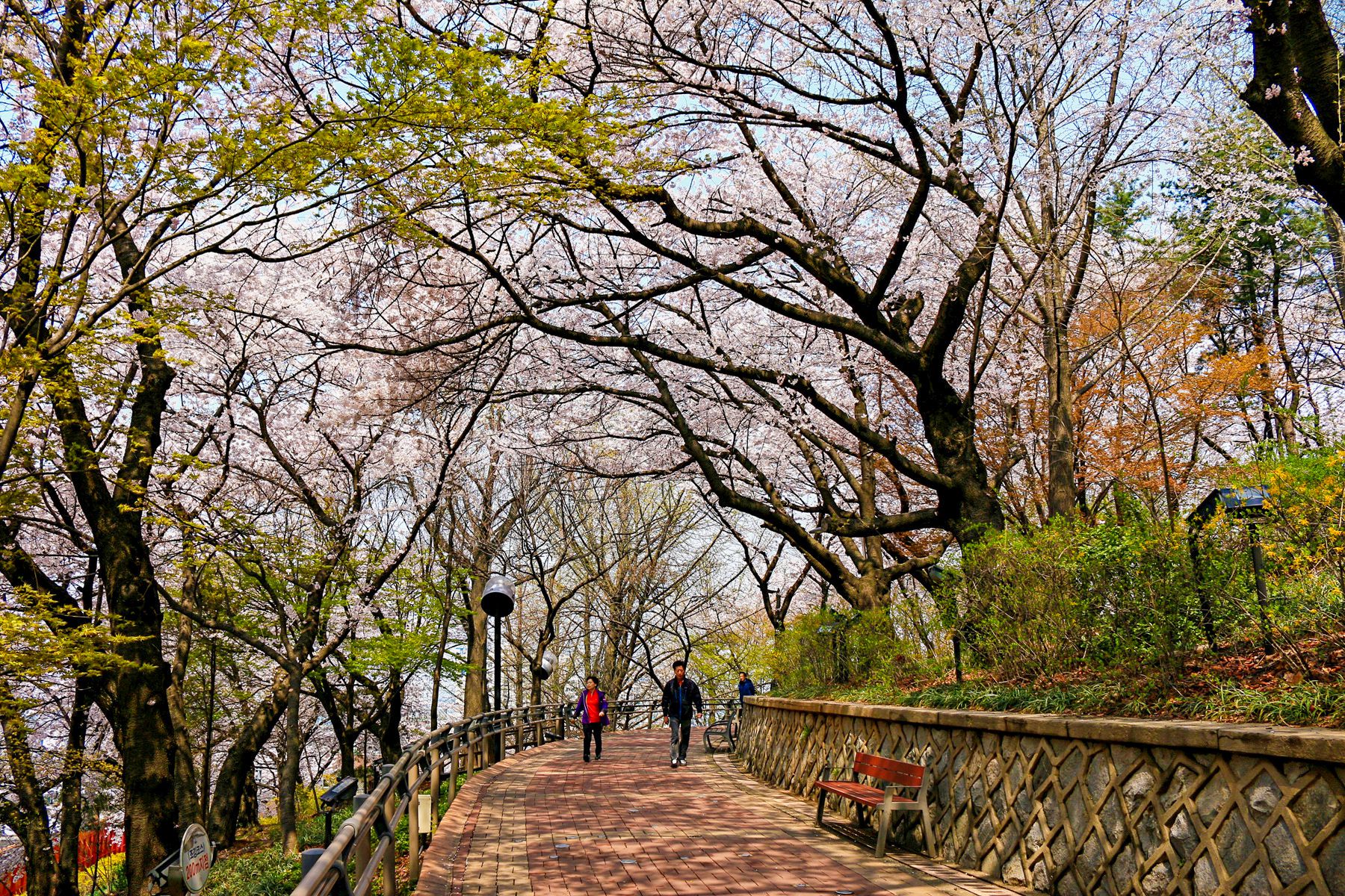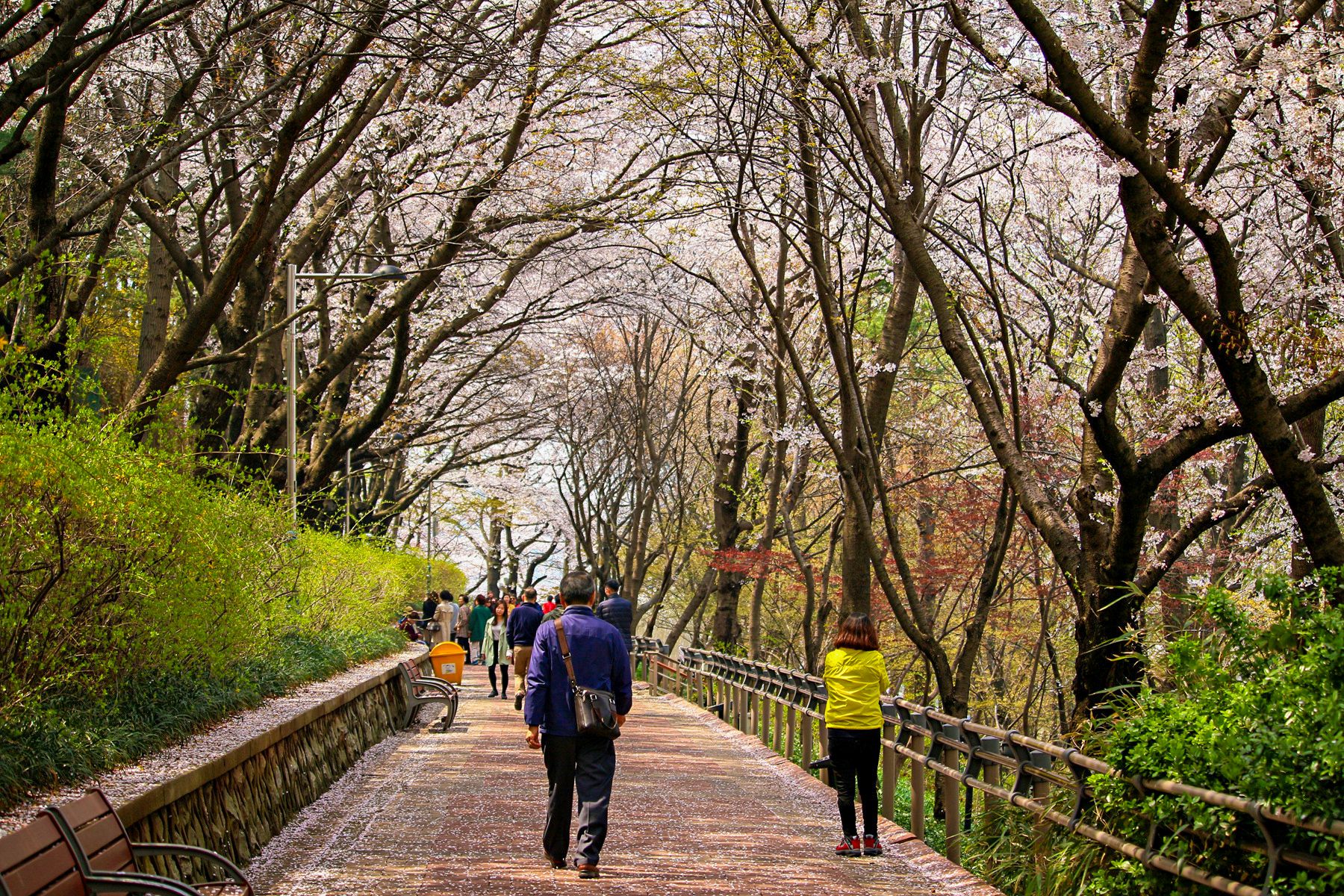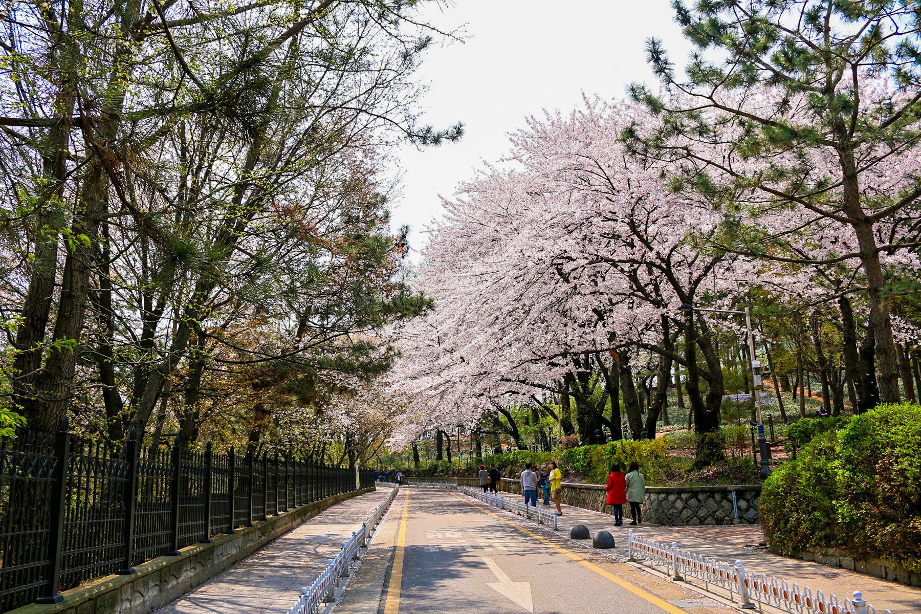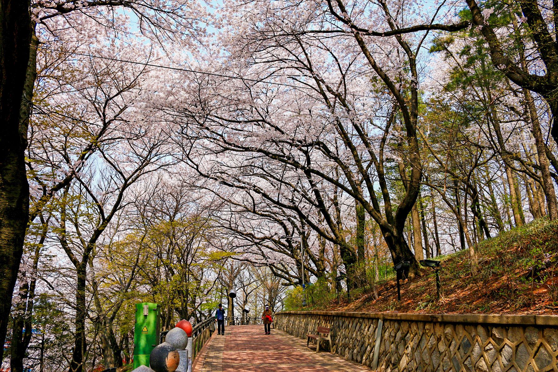 산책길 위로 길게 쭉 뻗은 벚나무들이 아름다운 꽃을 만개하여