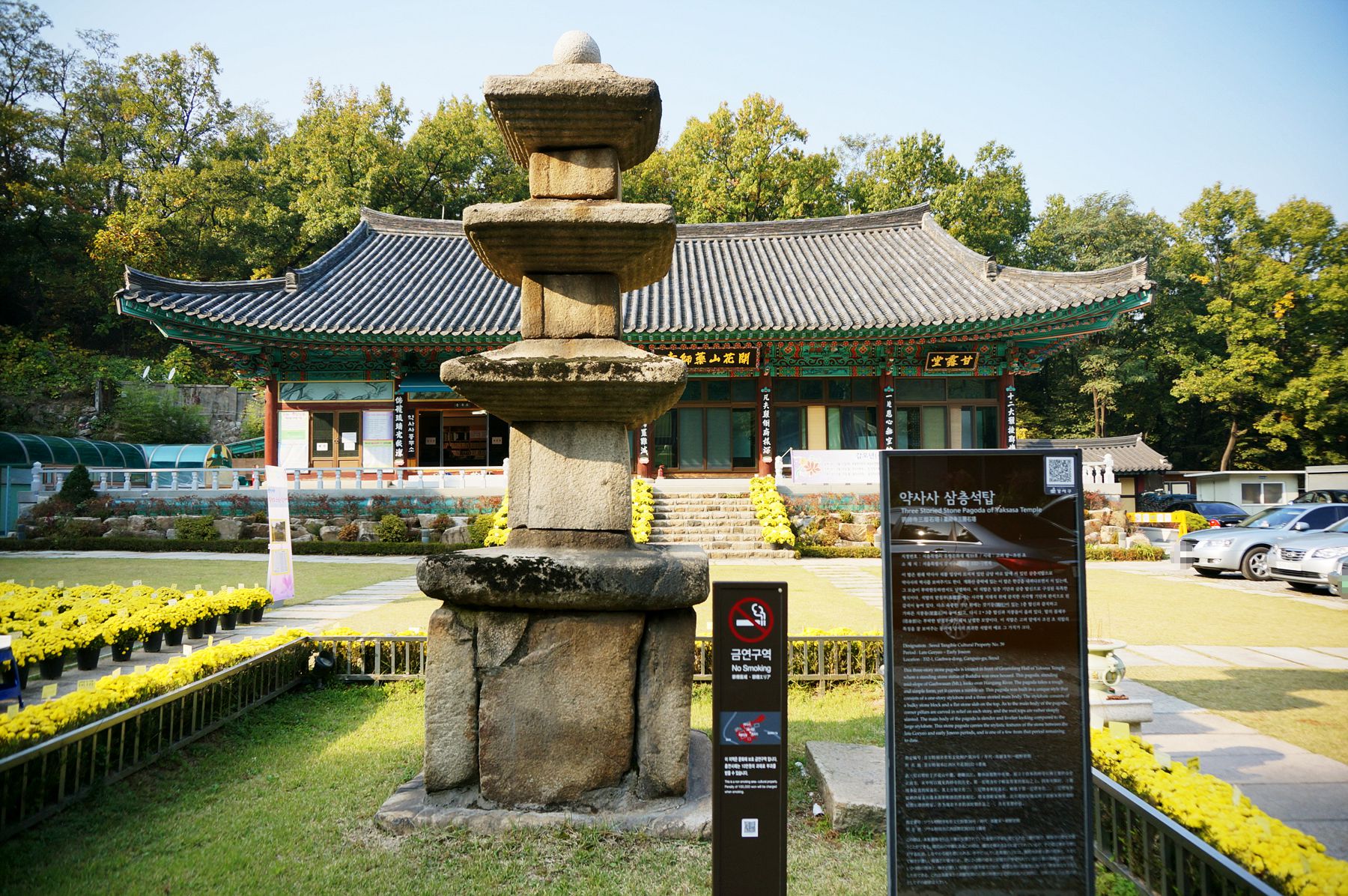 약사사에는 중앙에 삼층석탑이 자리하고 있습니다.