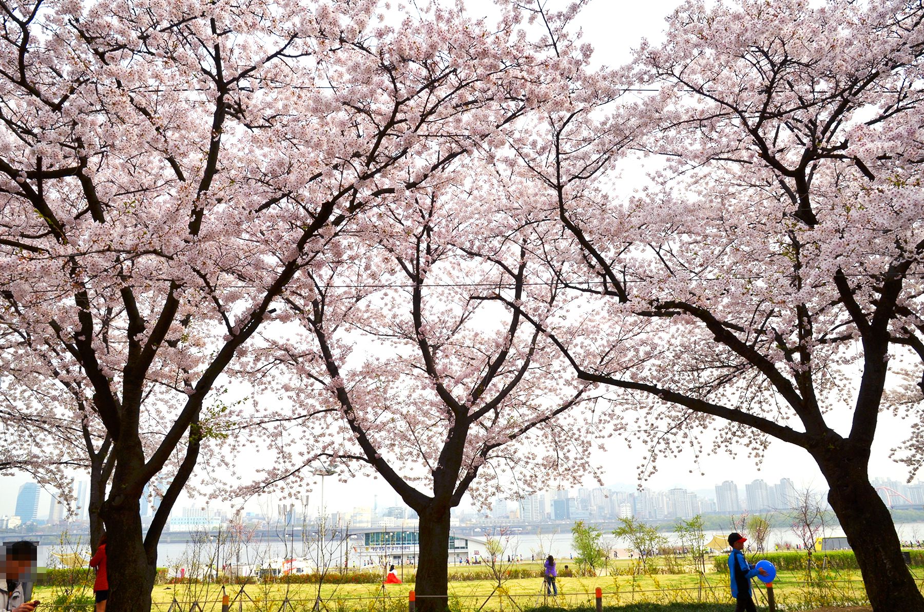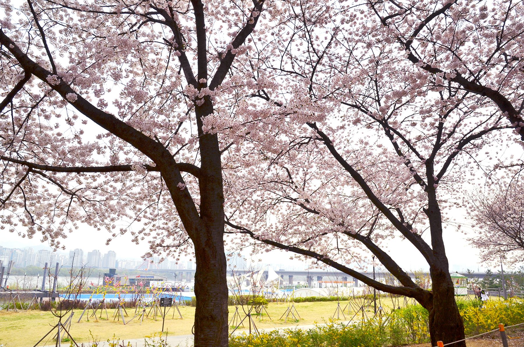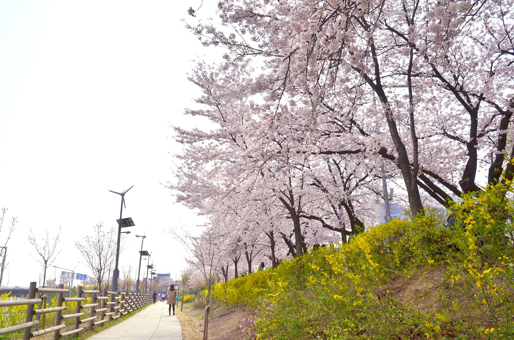 한강과 한강공원의 노란색의 빛 고운 유채꽃이 벚꽃길과 함께 어우러져