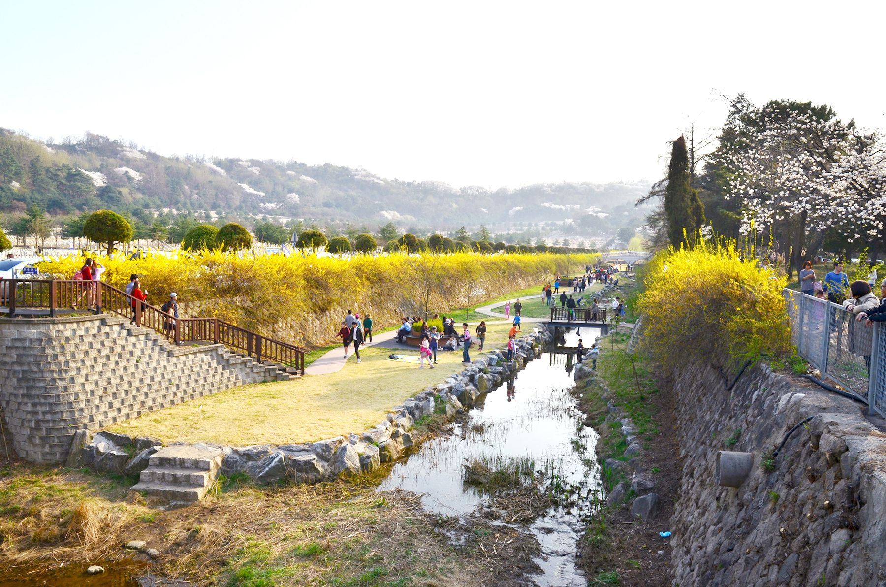 노오란 개나리가 병풍처럼 드리워진 현충천변 잔디밭은 삼삼오오 사람들이 모여 앉아 사진도 찍고,