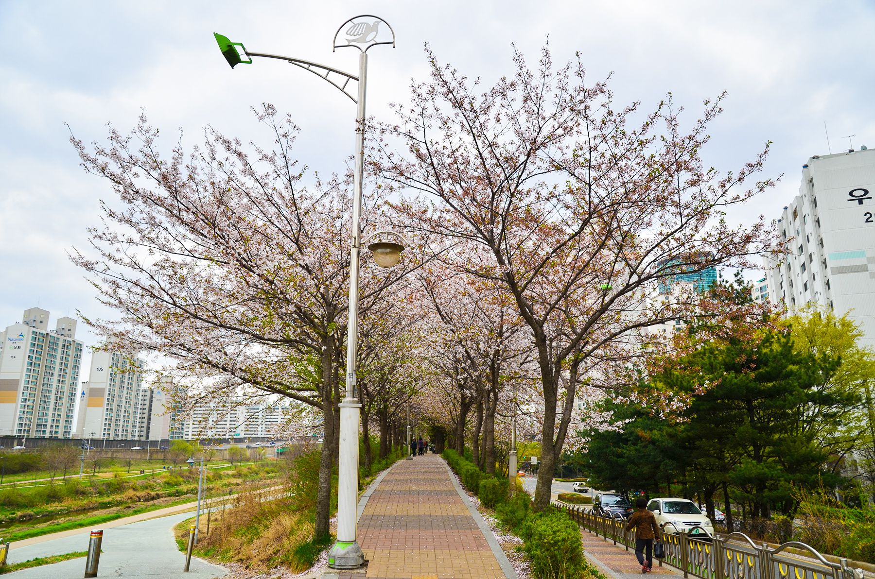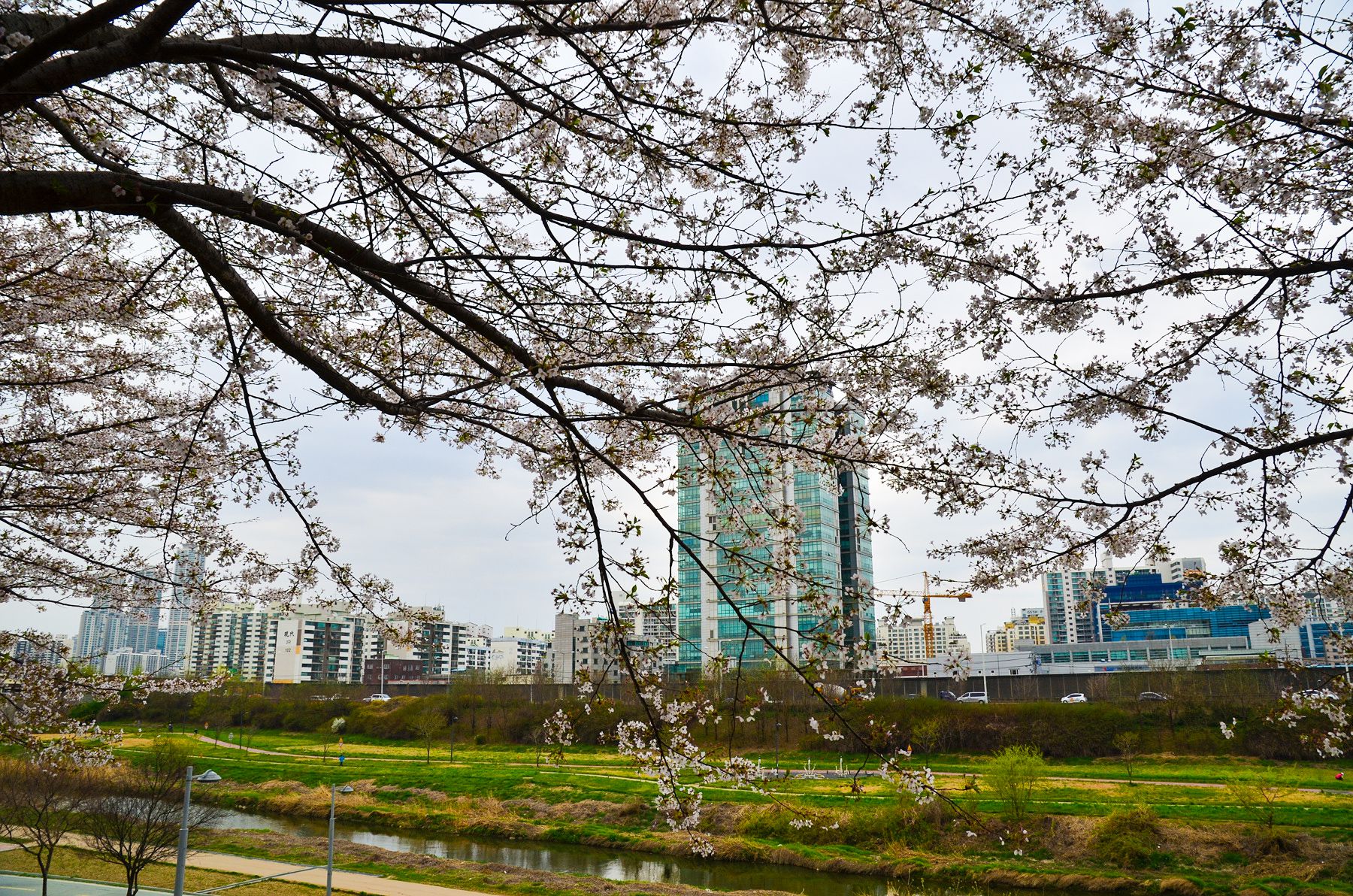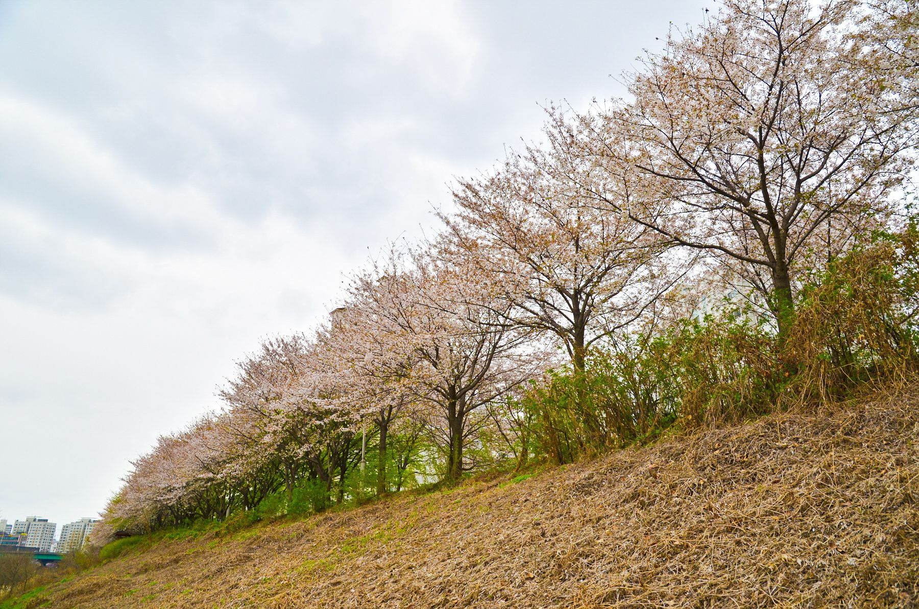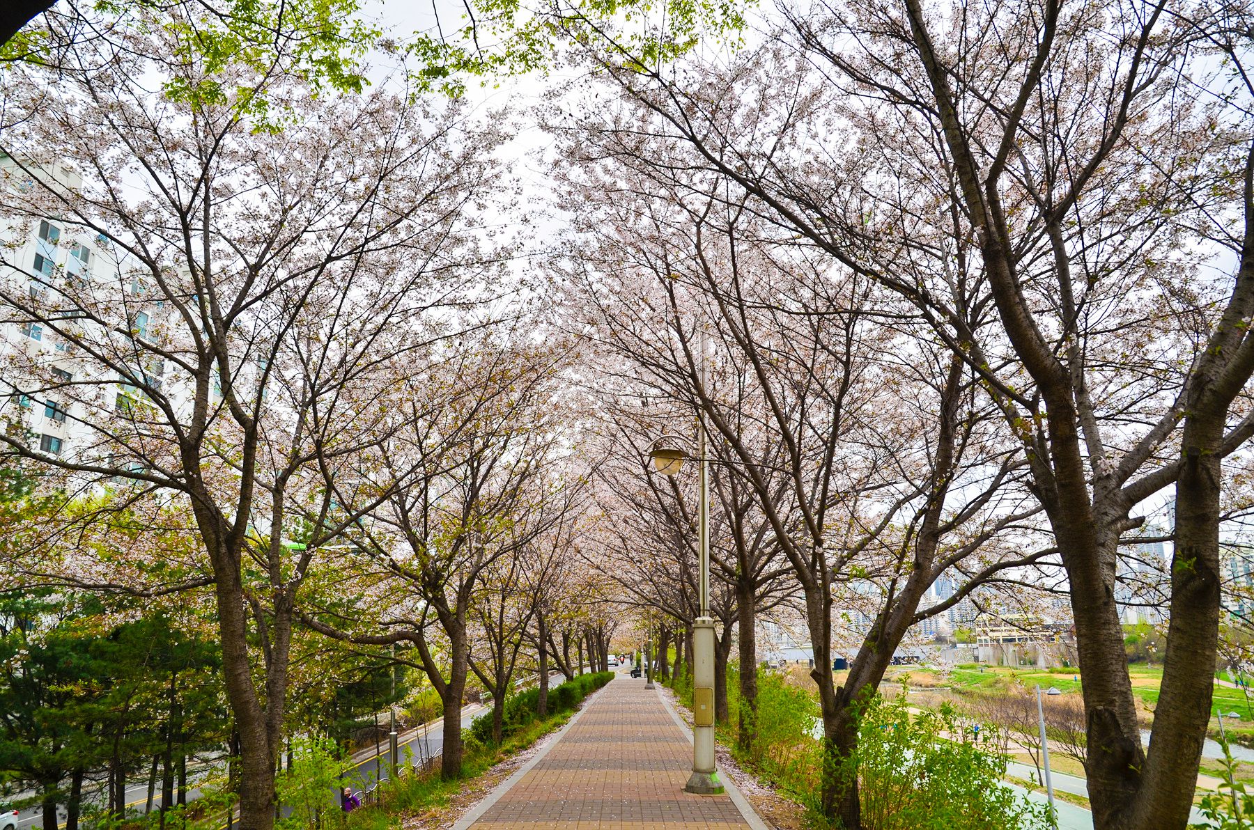 안양천과의 합류지점 근처의 벚꽃길이 특히 아름답습니다.