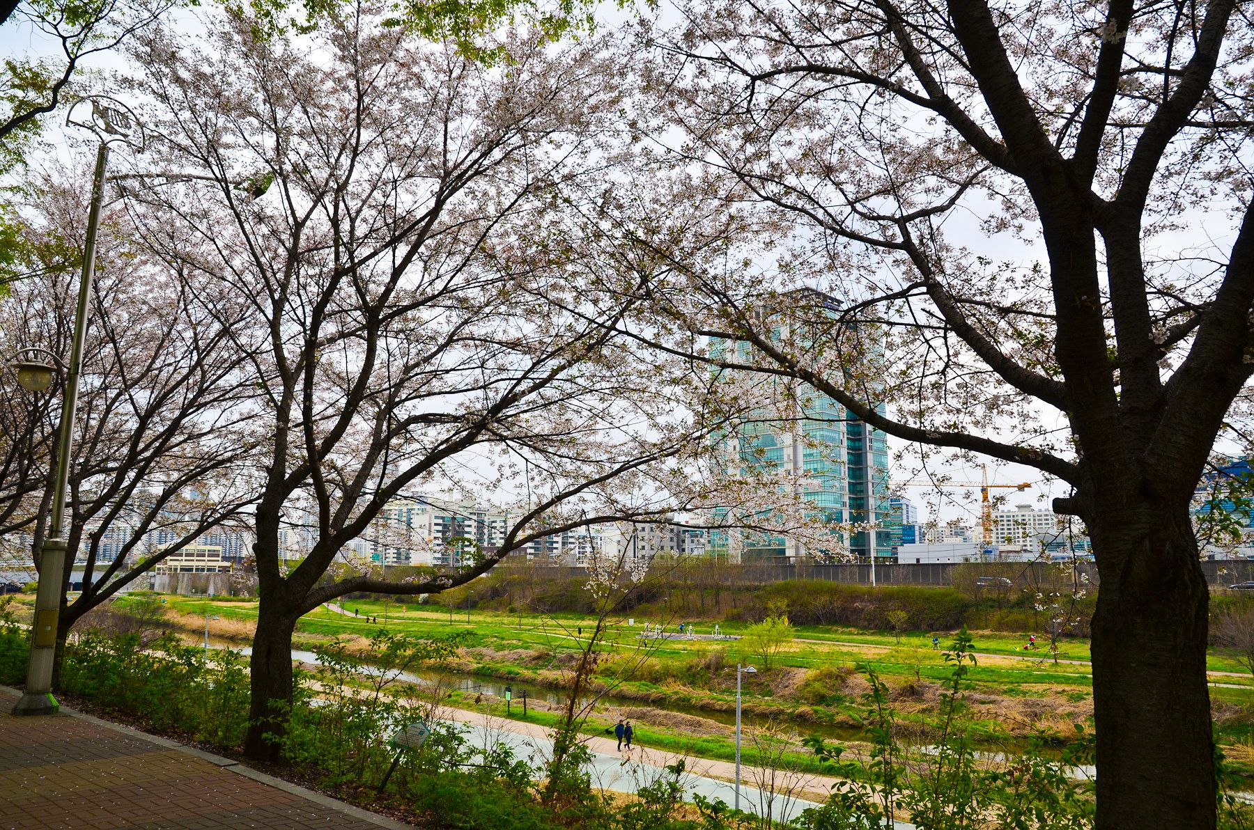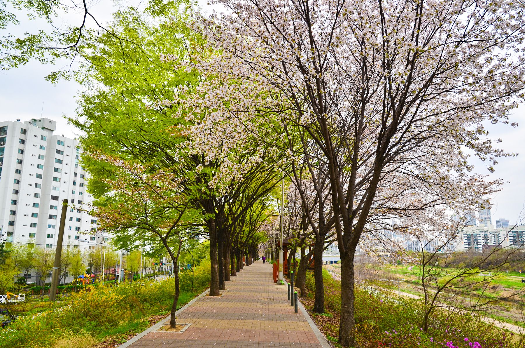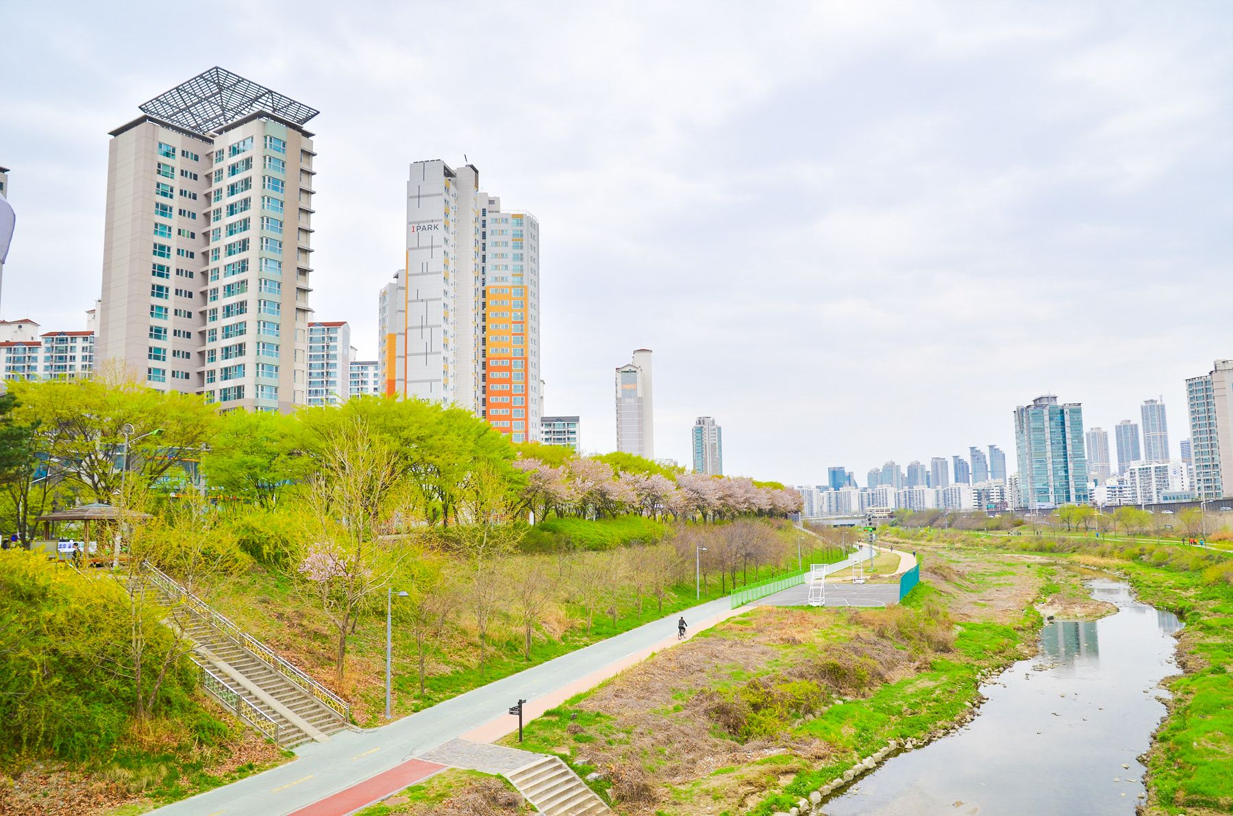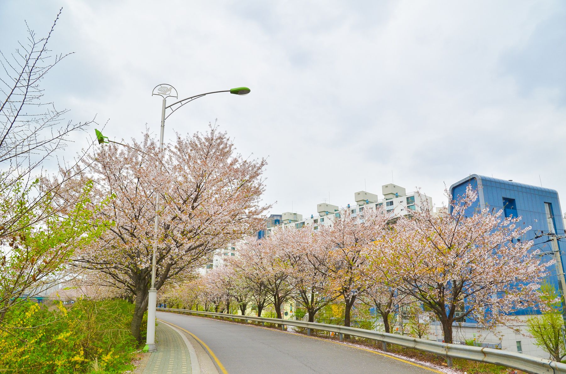 안양천과의 합류지점 근처의 벚꽃길이 특히 아름답습니다.