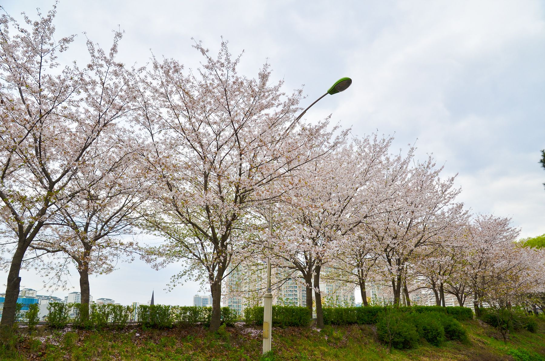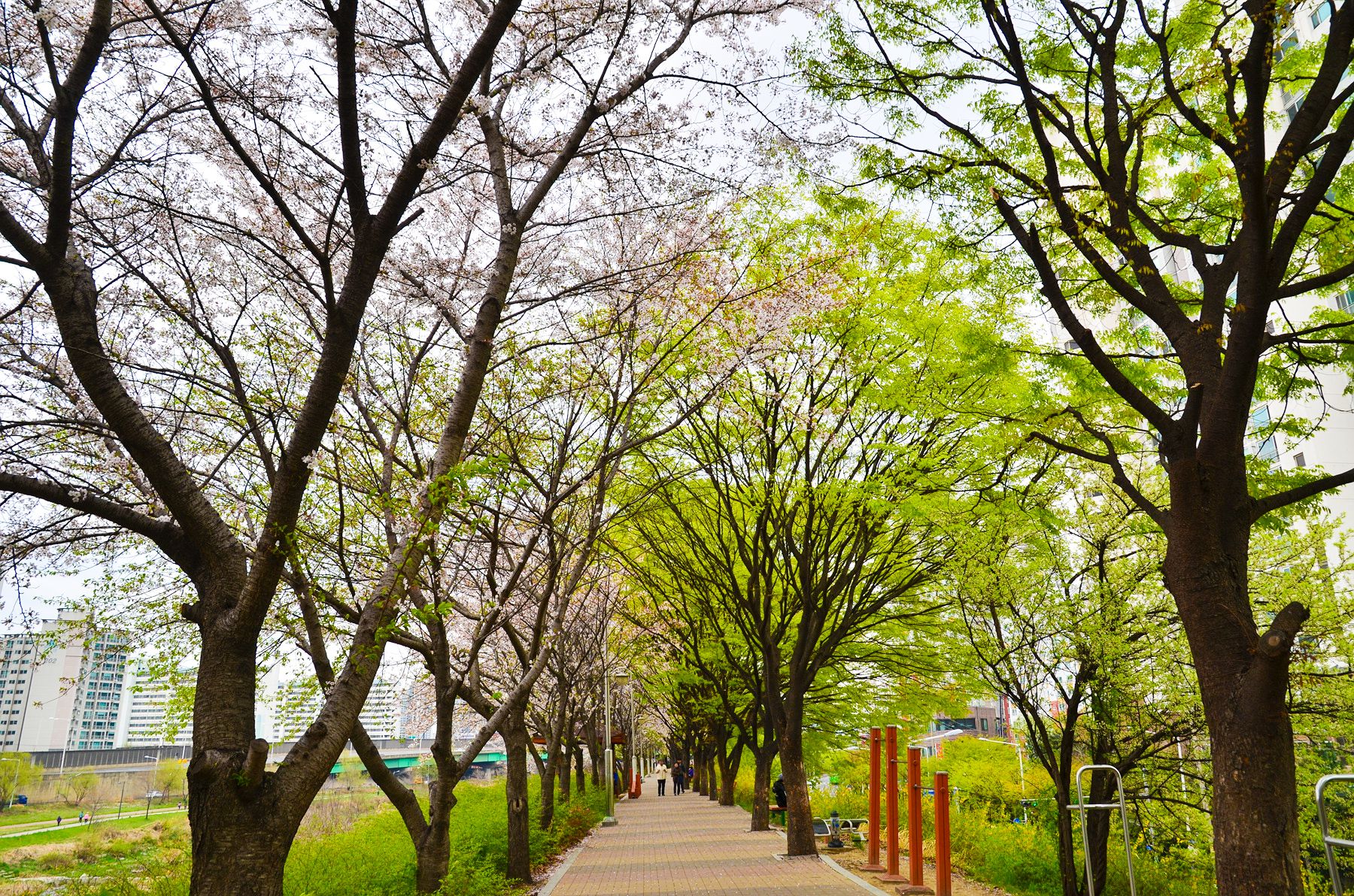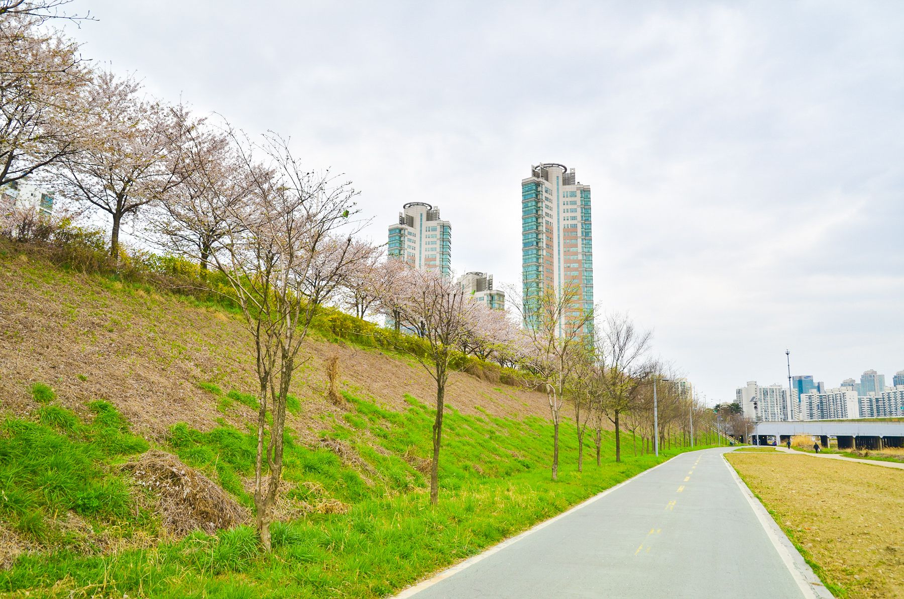 뚝방 벚꽃길 1.7km 구간 중 신도림역 초입에는 한 쪽만 벚나무가 심어져 있어 드문드문하게 느껴지지만