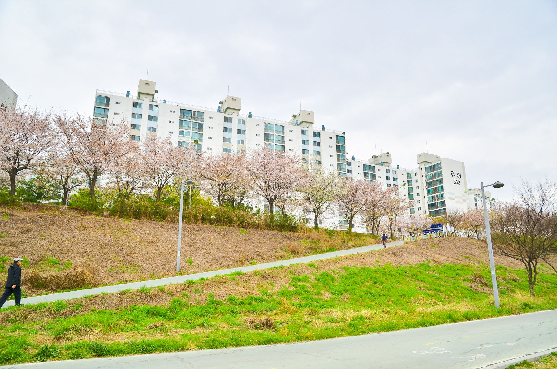 뚝방길을 따라 줄지어 심어진 벚나무가 참 아름답지요?