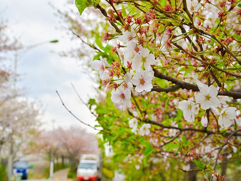 자동차가 지나갈 때면 진동에 의해 벚꽃이 흩날려 꽃비가 내립니다.