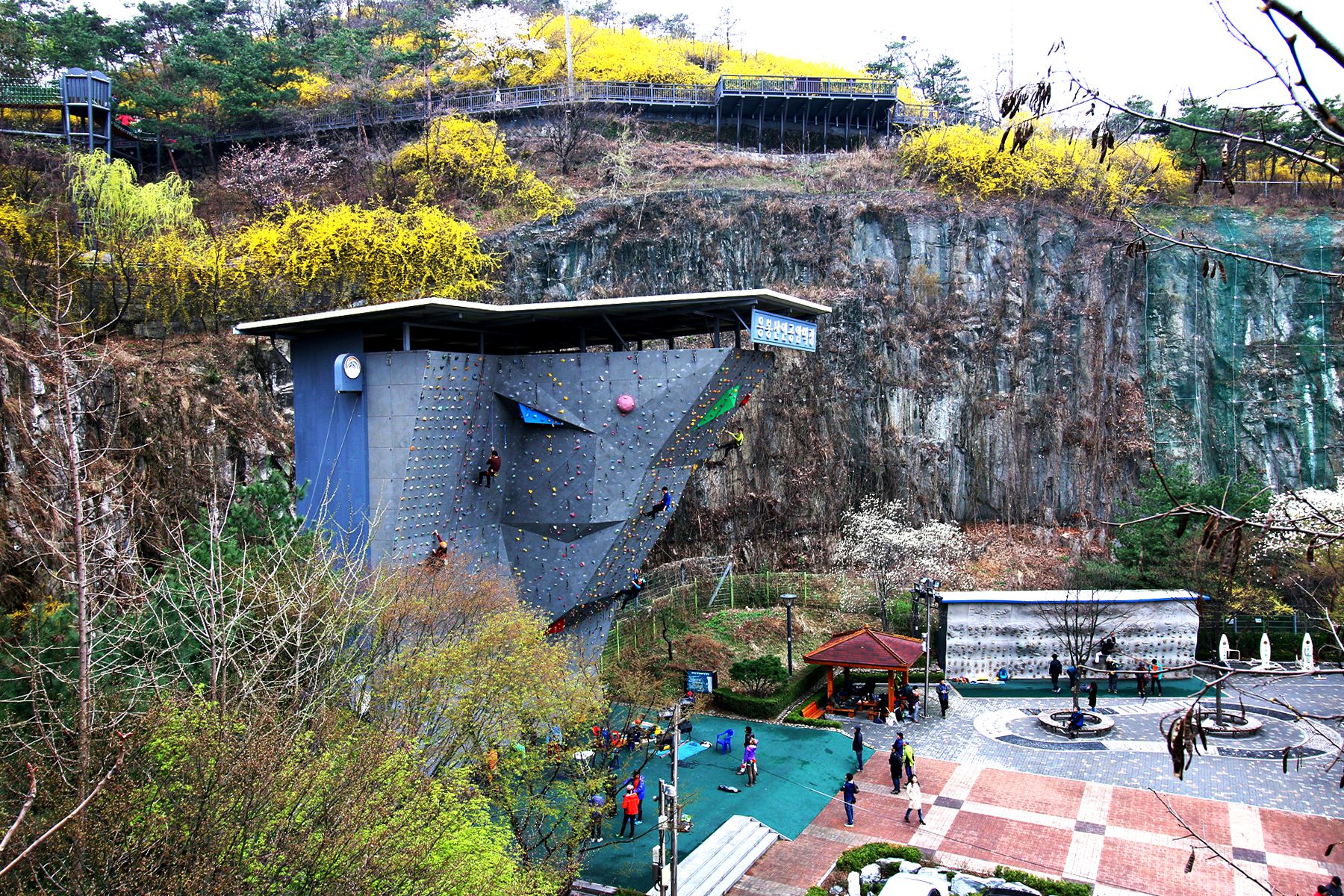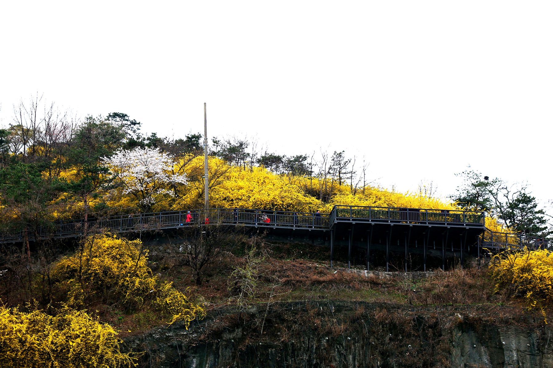 아찔한 높이의 암벽공원 뒤로는 개나리가 멋지게 피어있어서 장관을 이루고 있습니다.