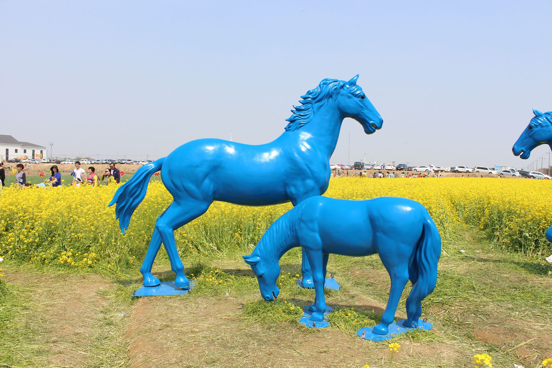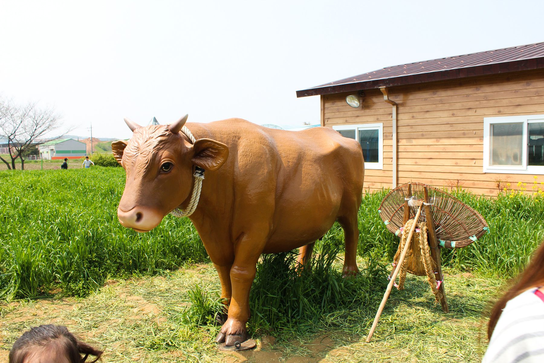 소는 푸른 보리밭에 서 있고 청마는 제주도를 상징하는 유채꽃밭에
