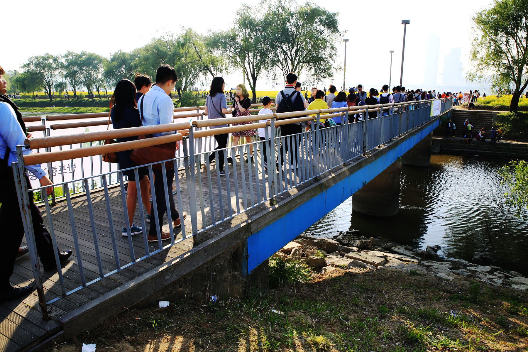 유채꽃 축제기간에 서래섬으로 들어가는 진입로 서래1교 앞에서는