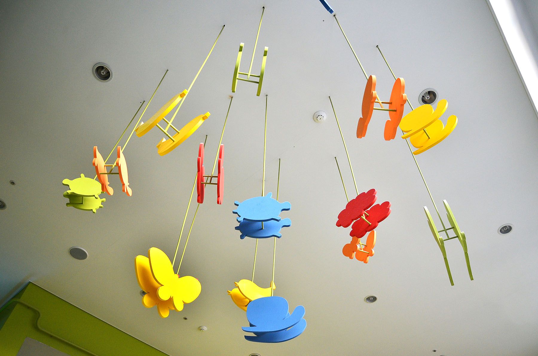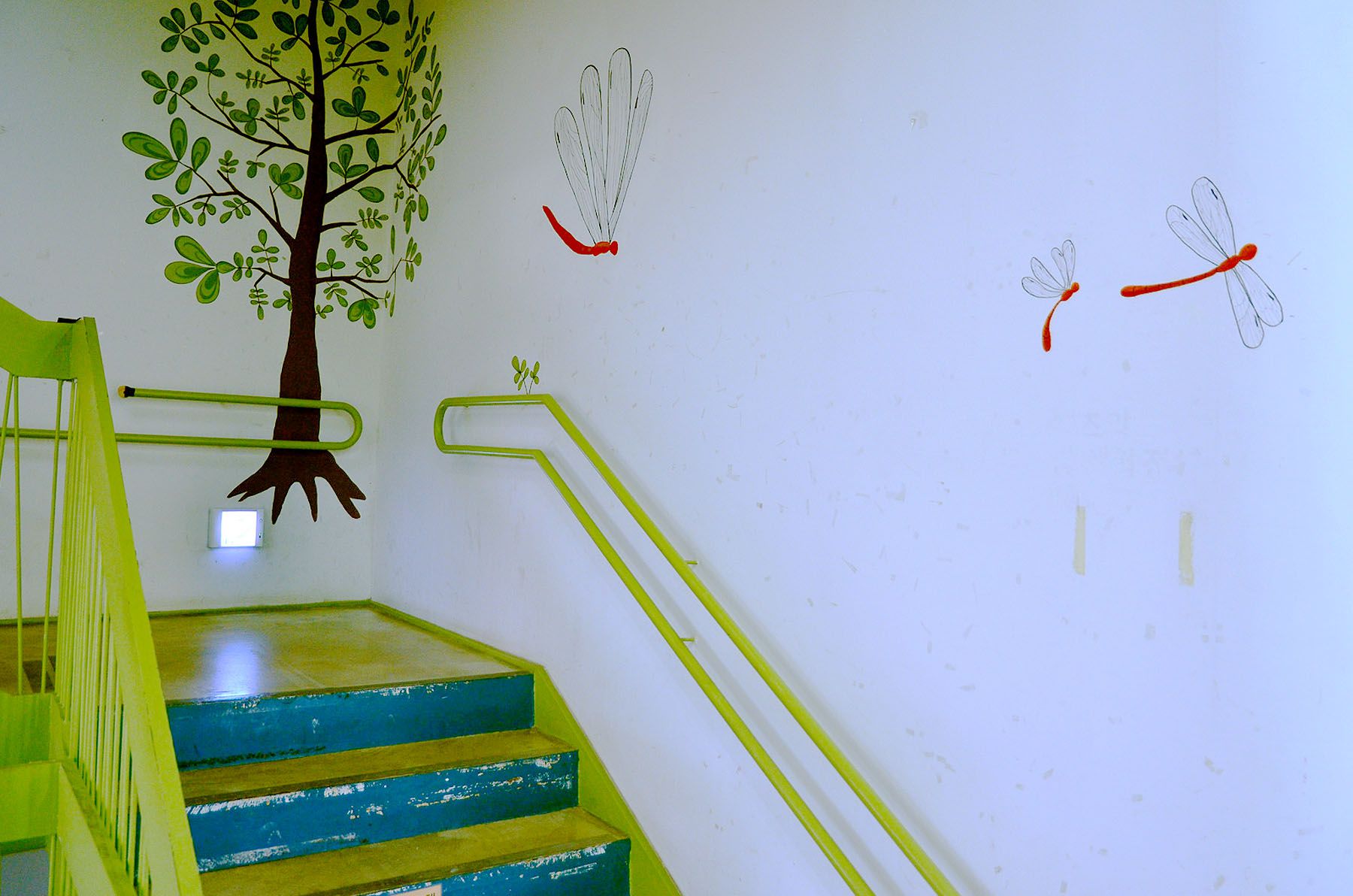 전시실로 이동하는 계단에는 어린이들에게 친근한 잠자리와 나무 등  어린이들의 시선을 끊임없이 자극하는 인테리어로 구성되어 있습니다.
