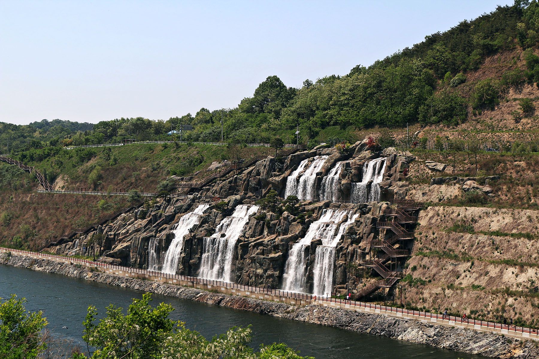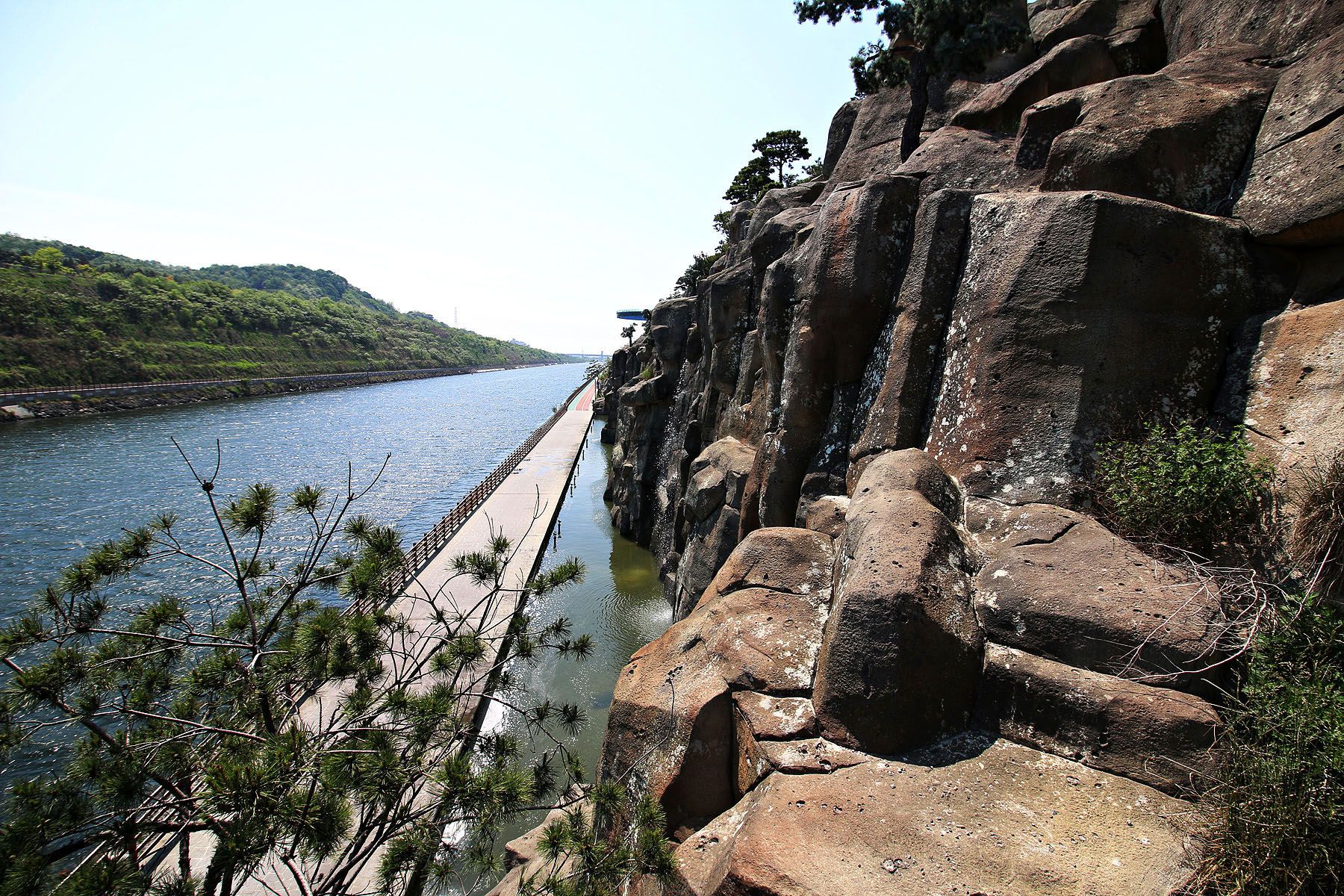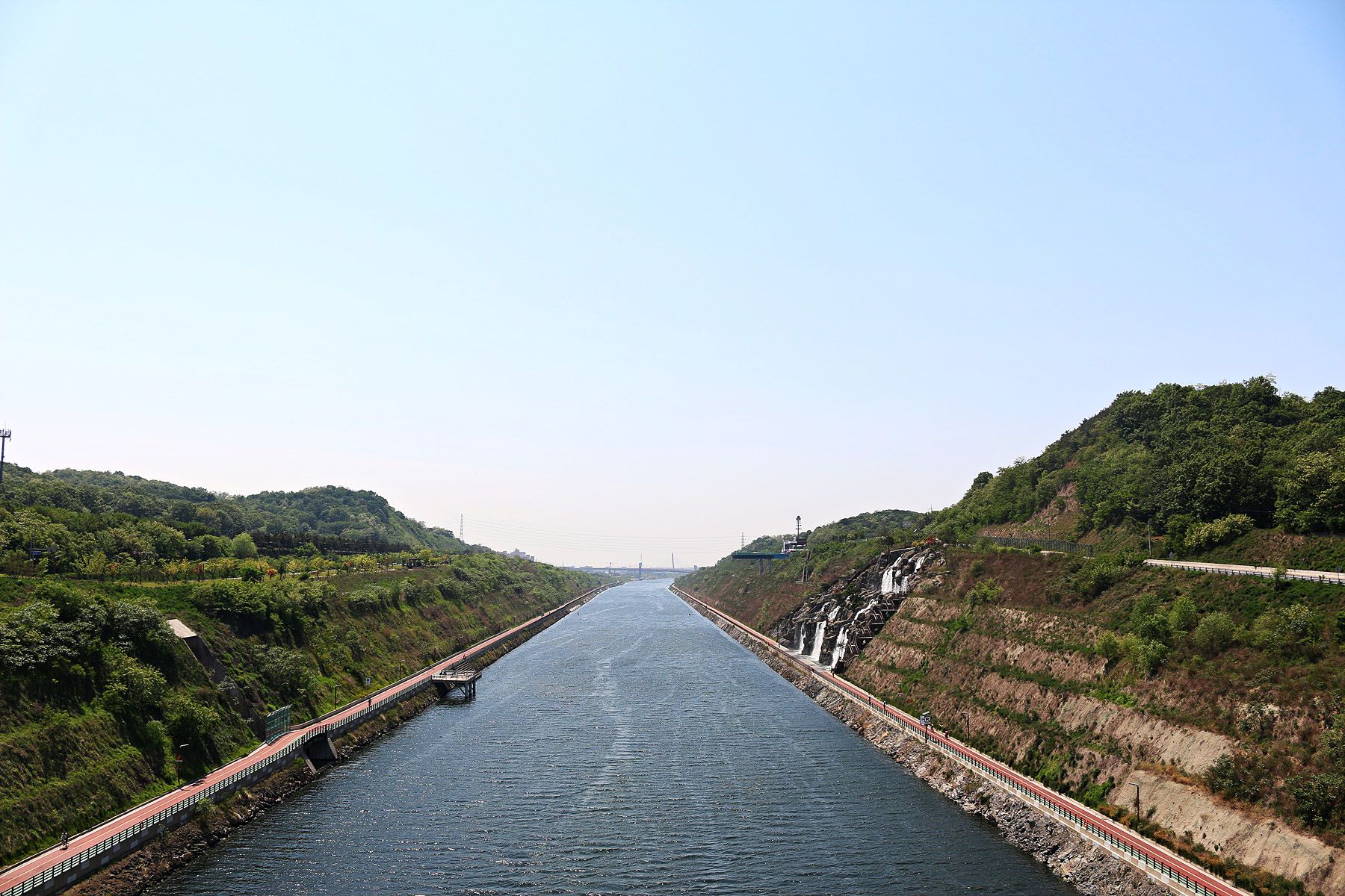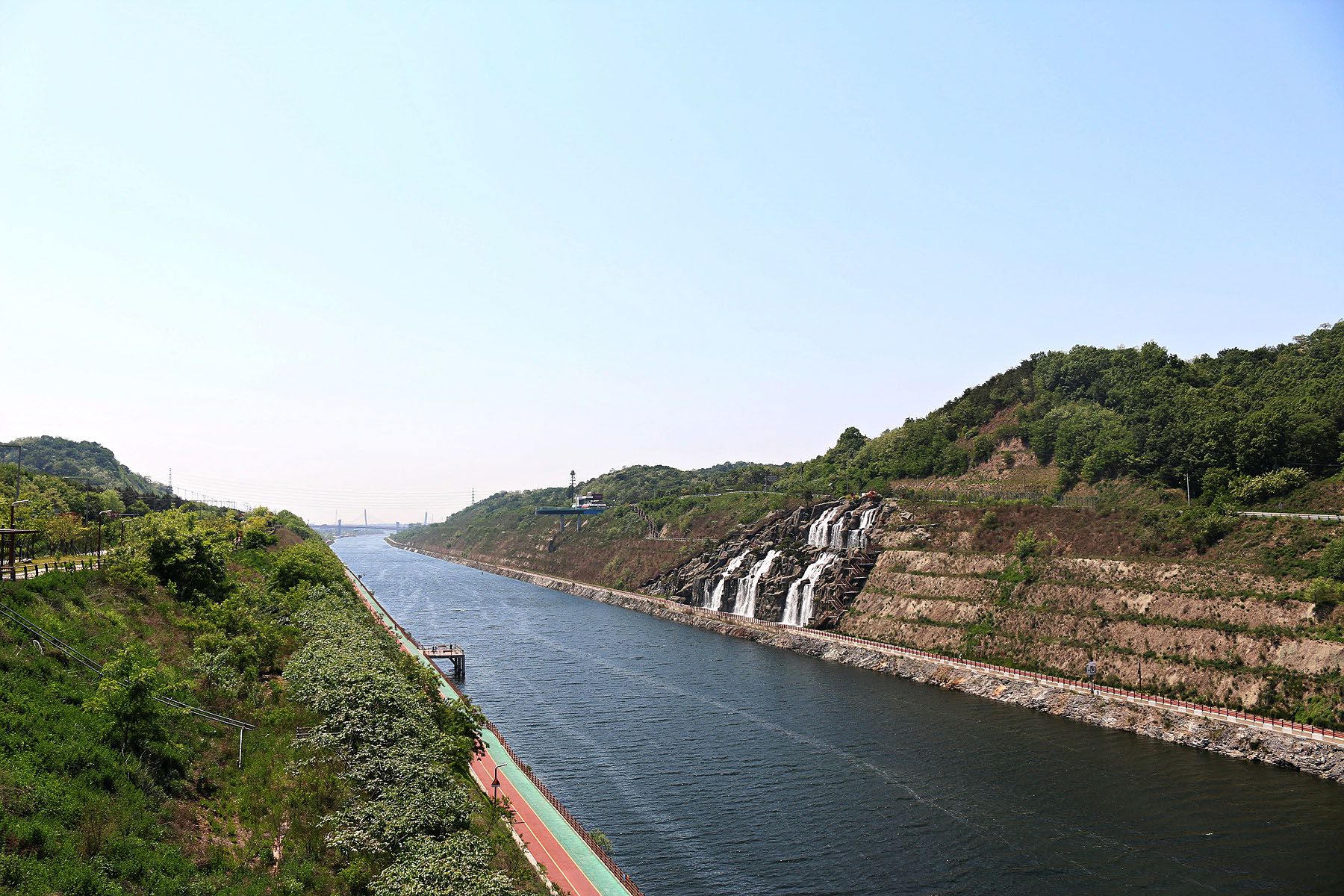 경인아라뱃길에는 미국의 그랜드 캐년과 계양산을 모티브로 만든 국내 최대의 인공포폭인 아라폭포가 있습니다.