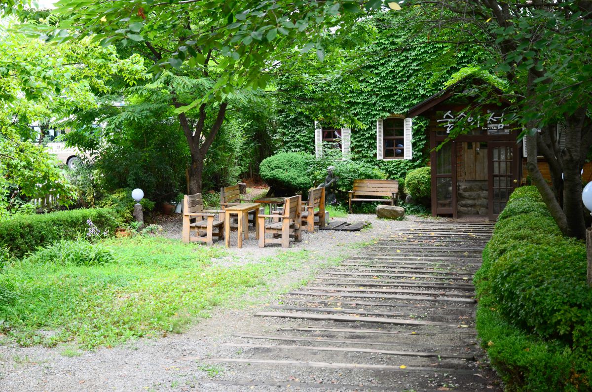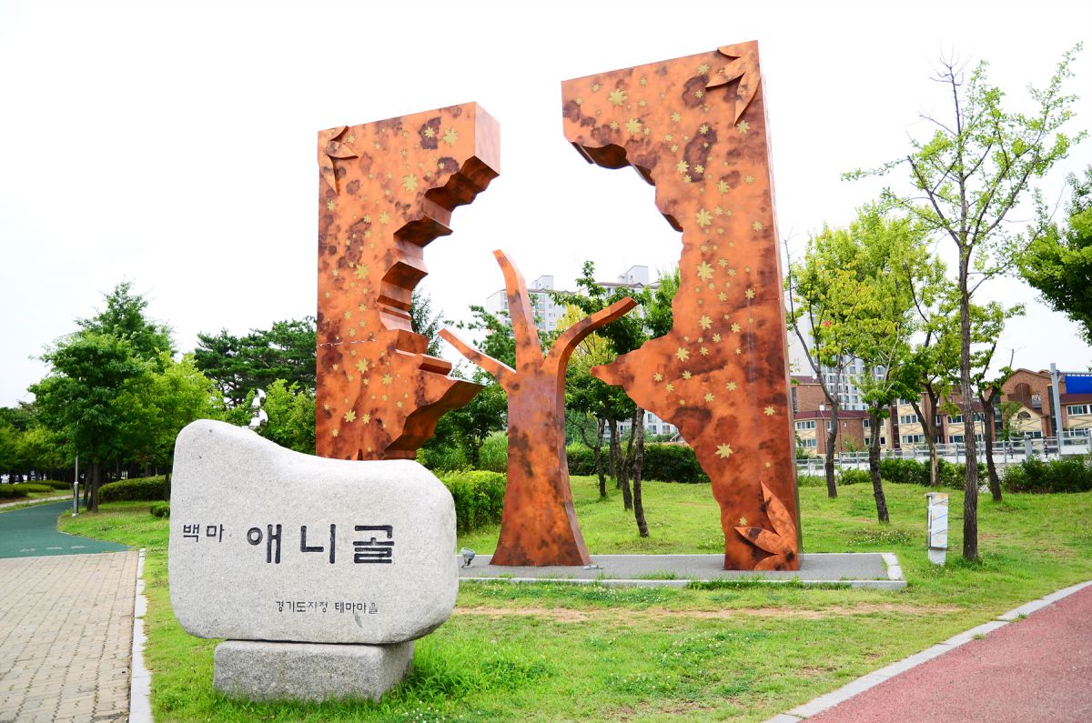 특색을 갖춘 음식점의 야외조각공원과 애니골을 상징하는 애니골트리는
