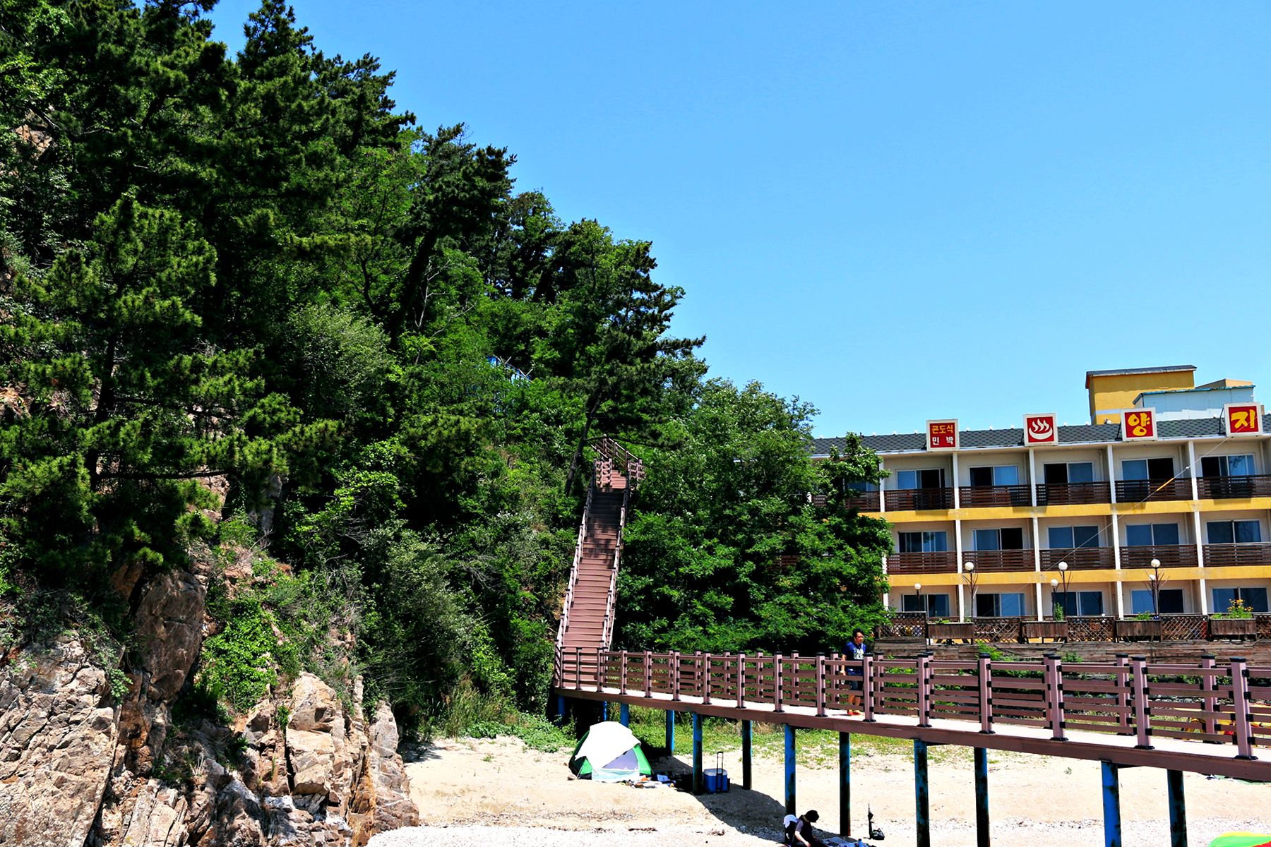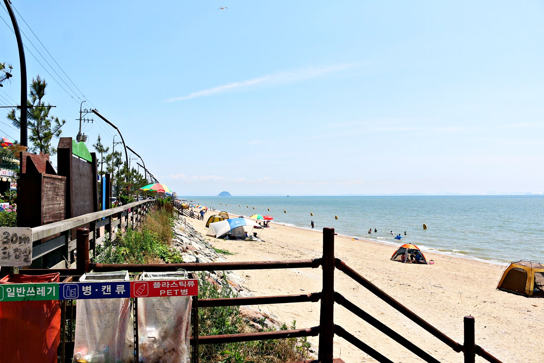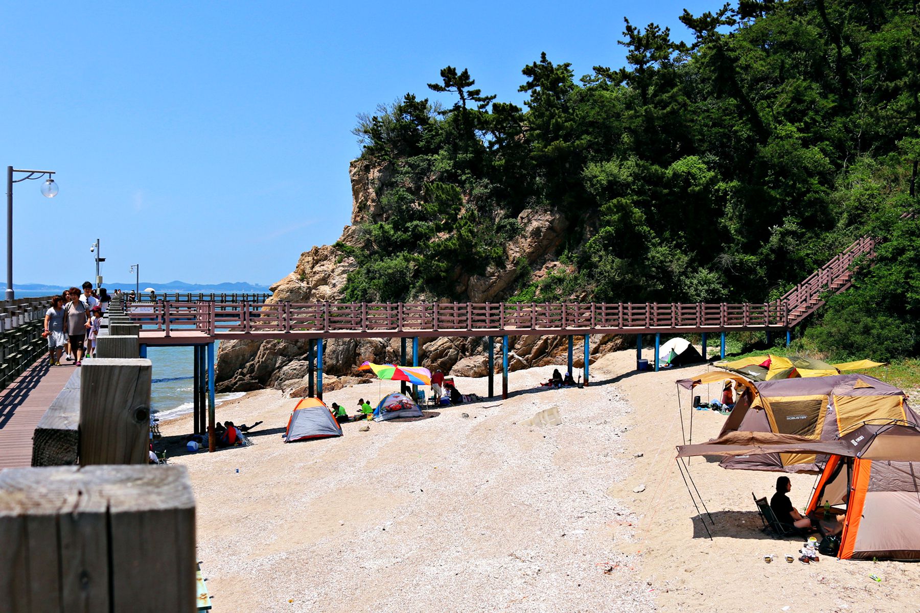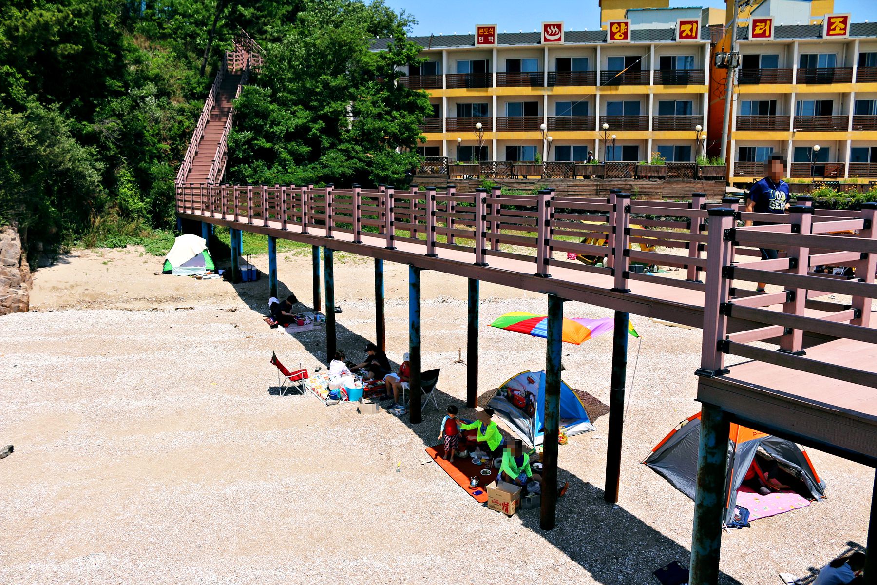 바다와 가까운 곳이라서 산책길 데크가 만들어 준 그늘에 텐트를 치고 물놀이도 하면서
