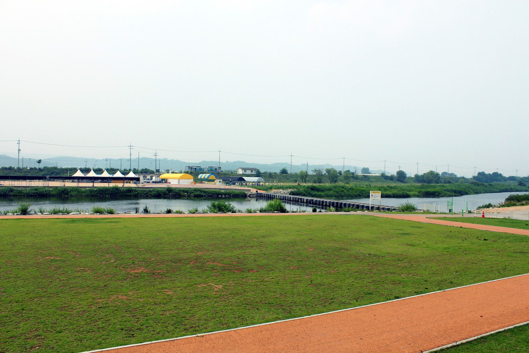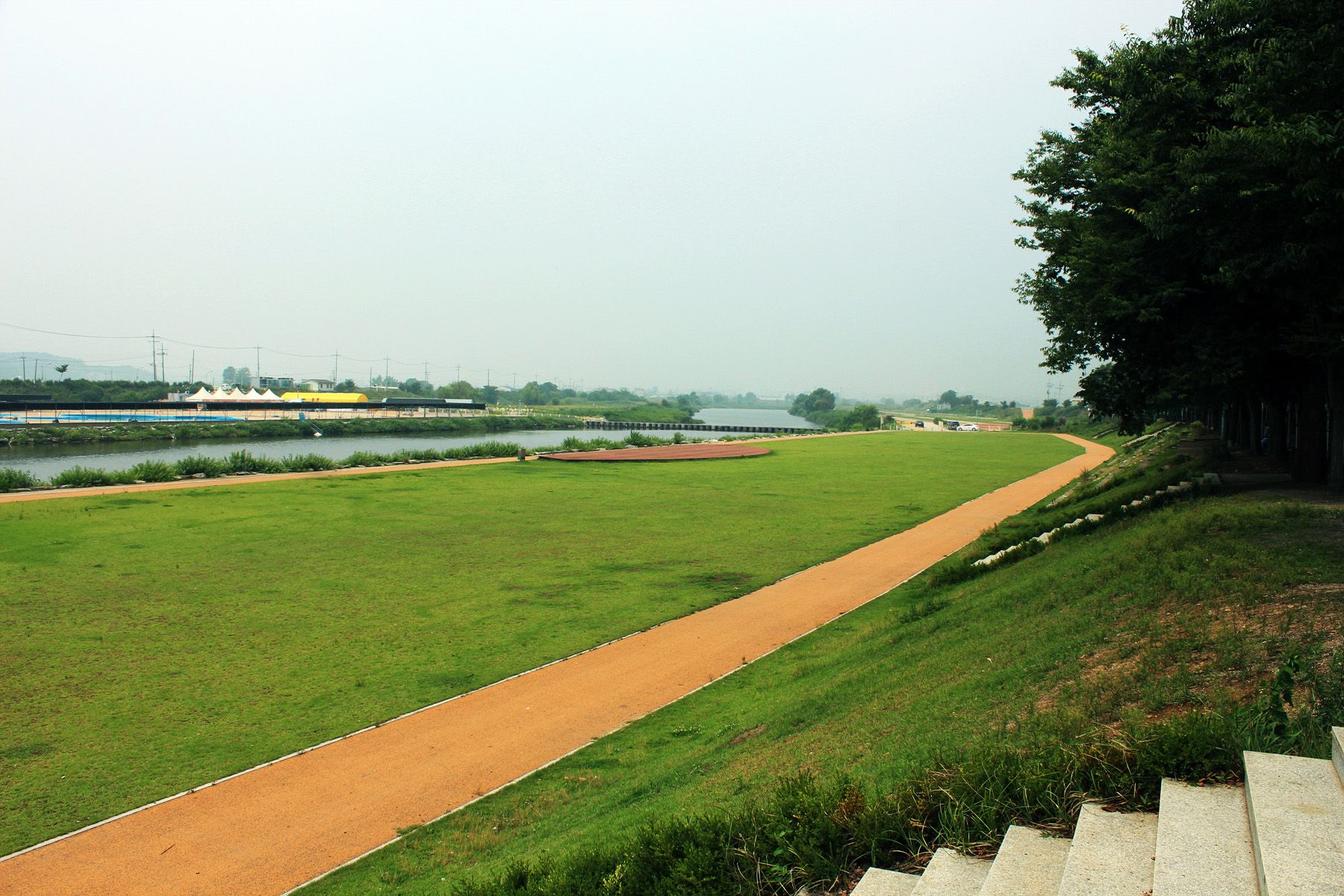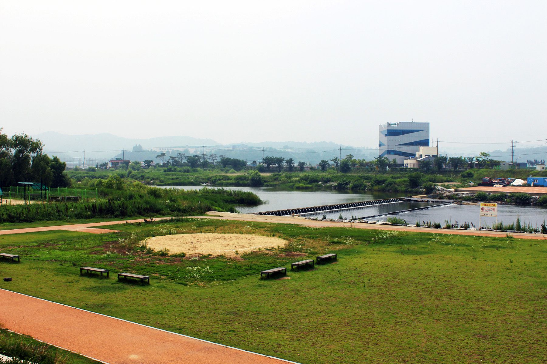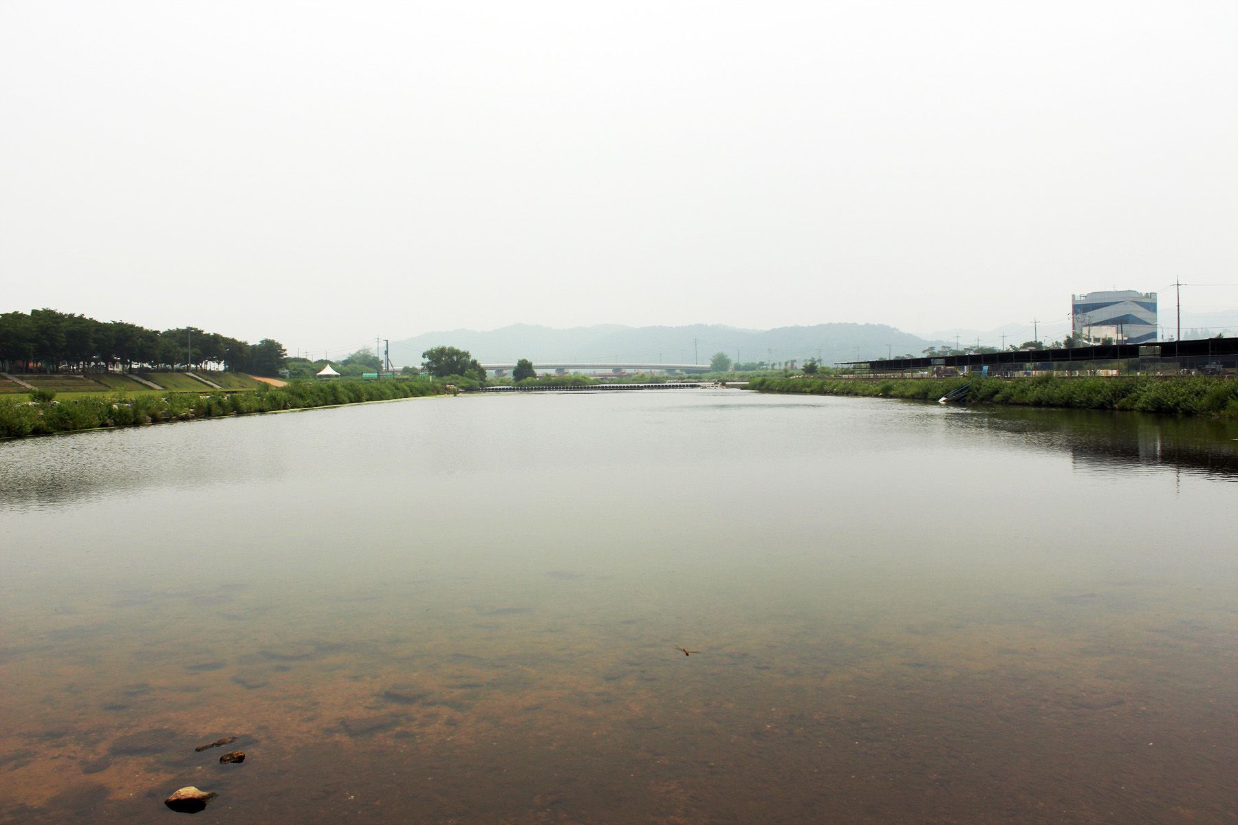 진위천이 시원하게 흐르는 유원지의 풍경에서 평화로움을 느낄 수 있습니다.