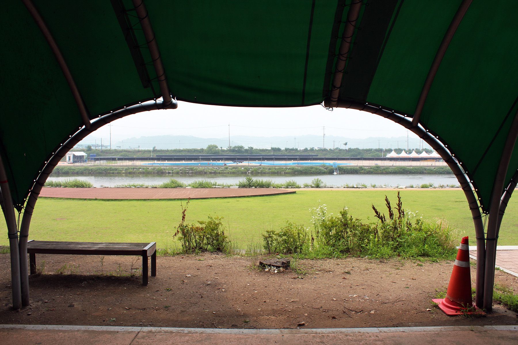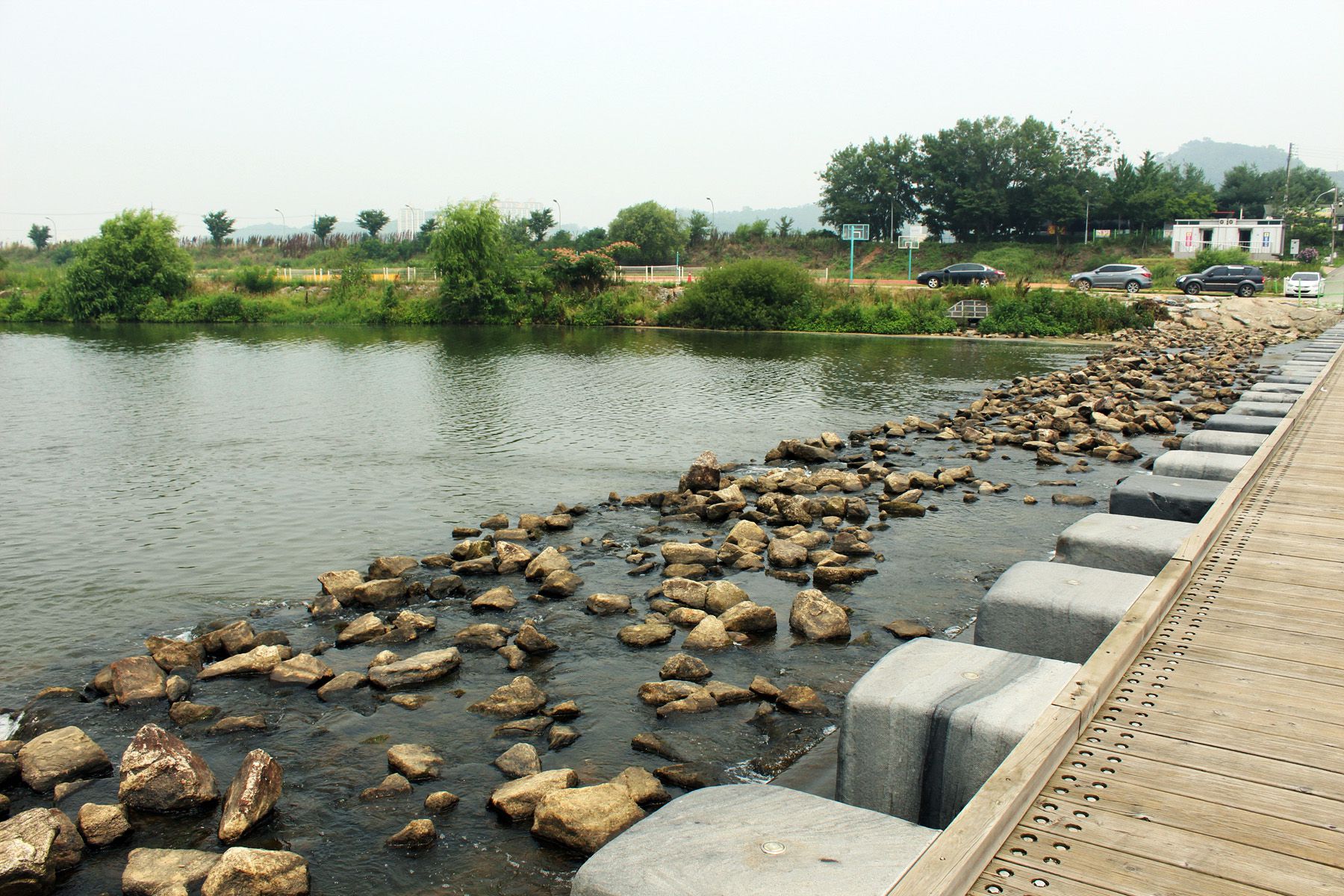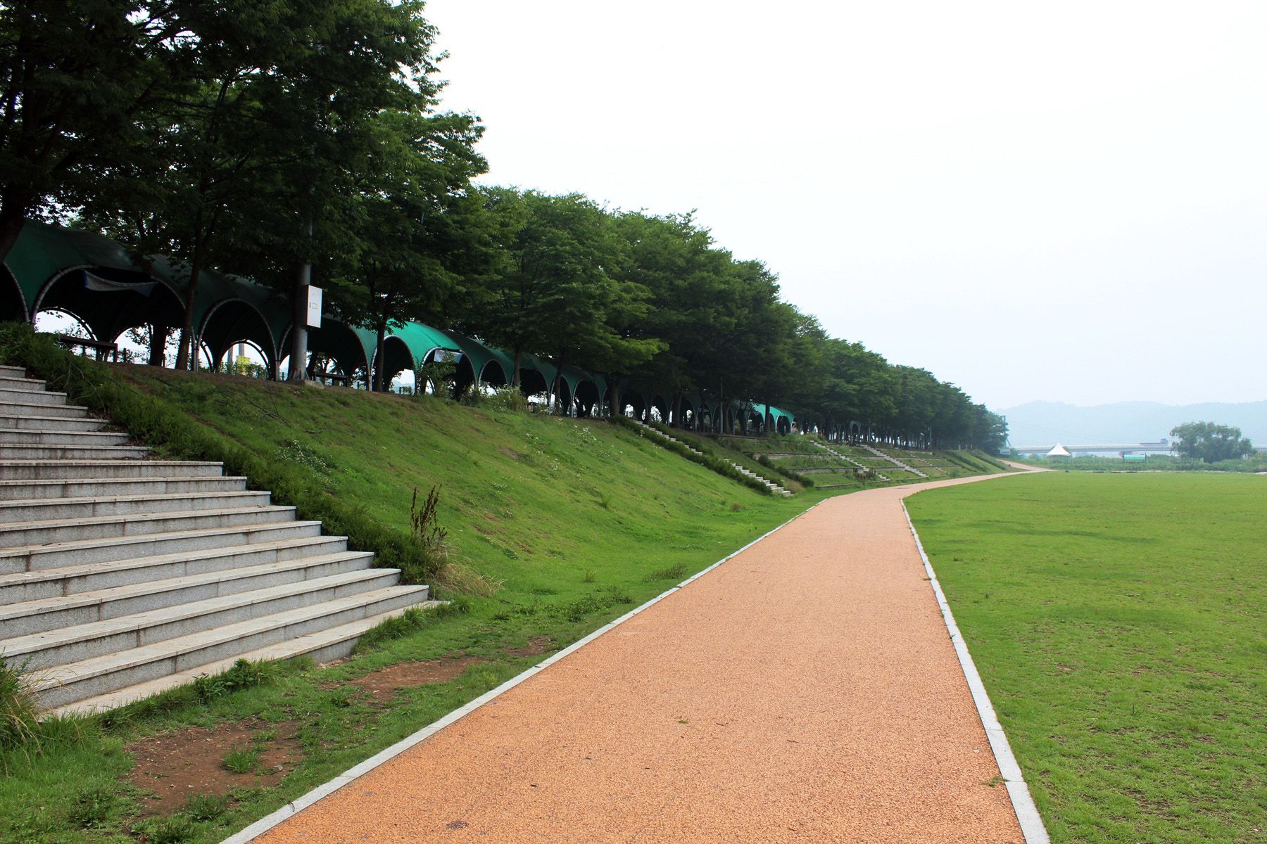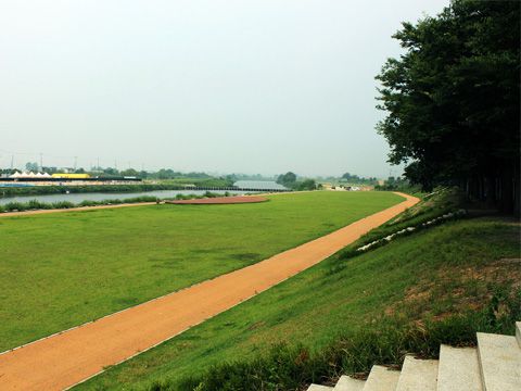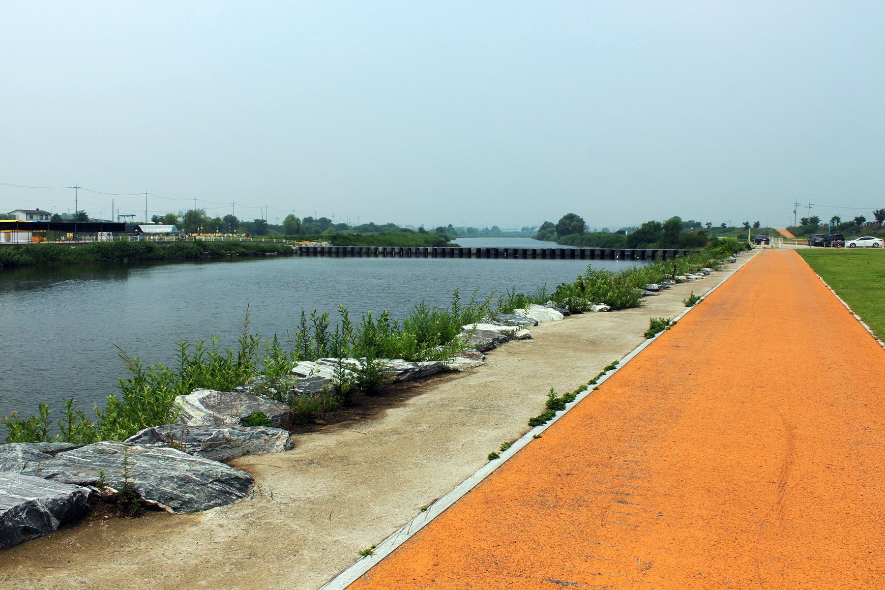 진위천이 시원하게 흐르는 유원지의 풍경에서 평화로움을 느낄 수 있습니다.