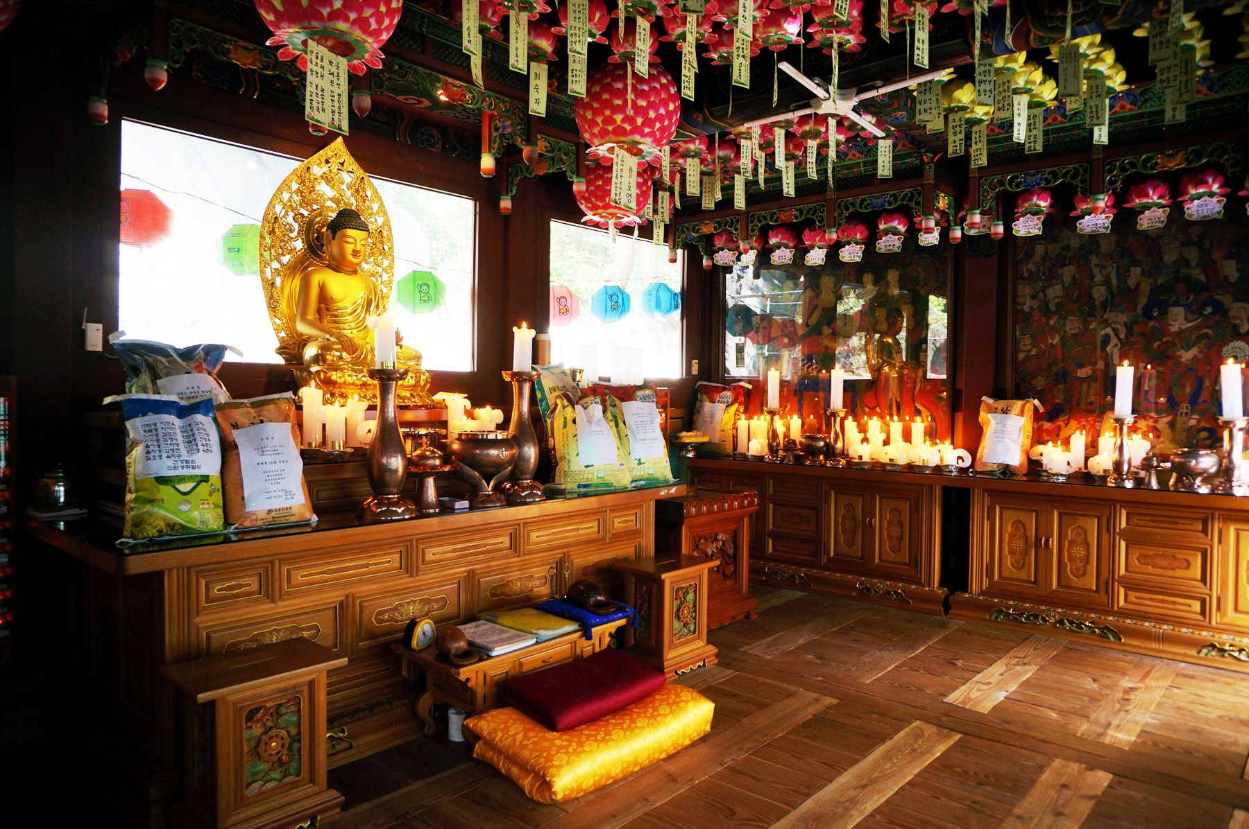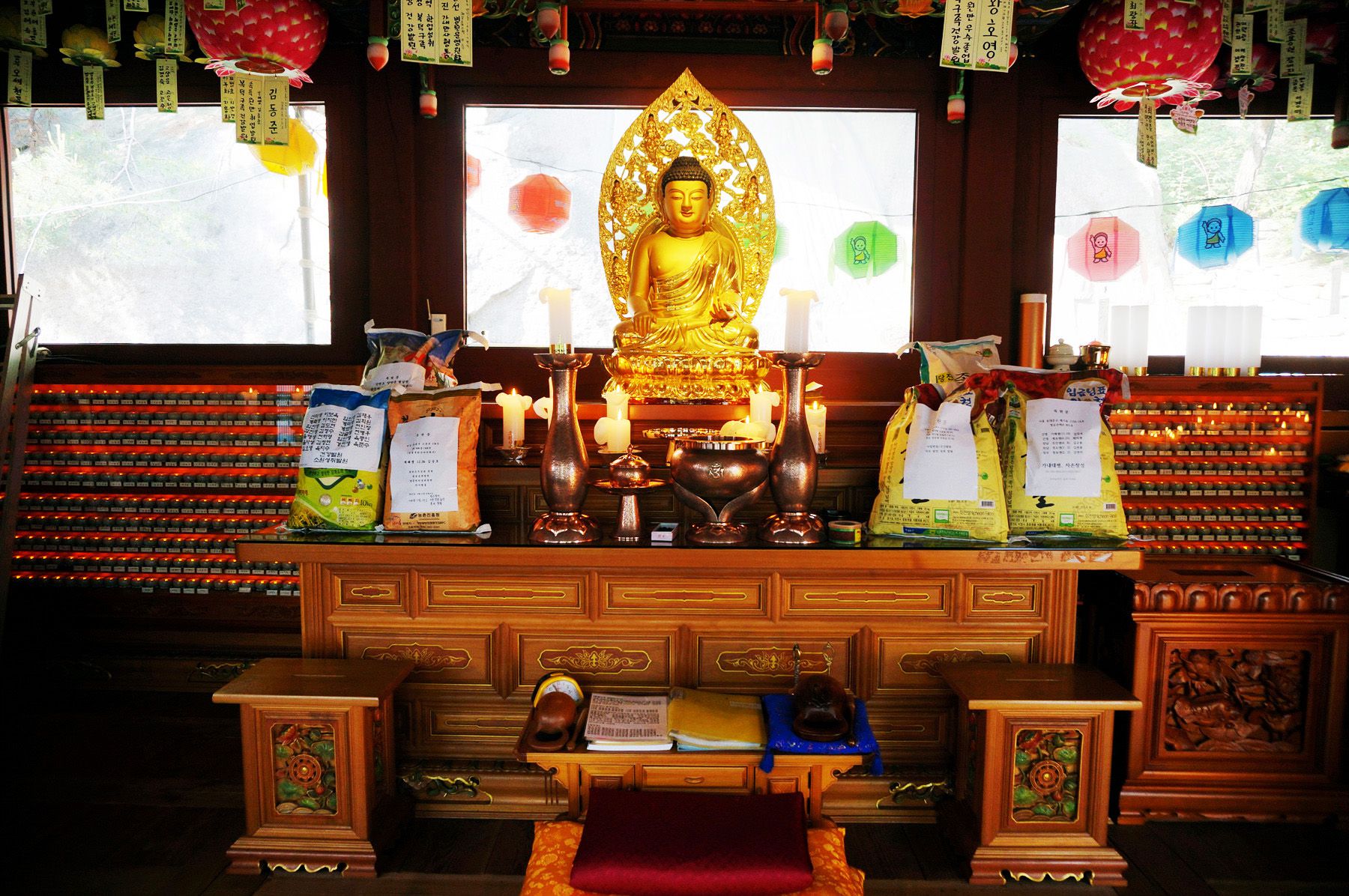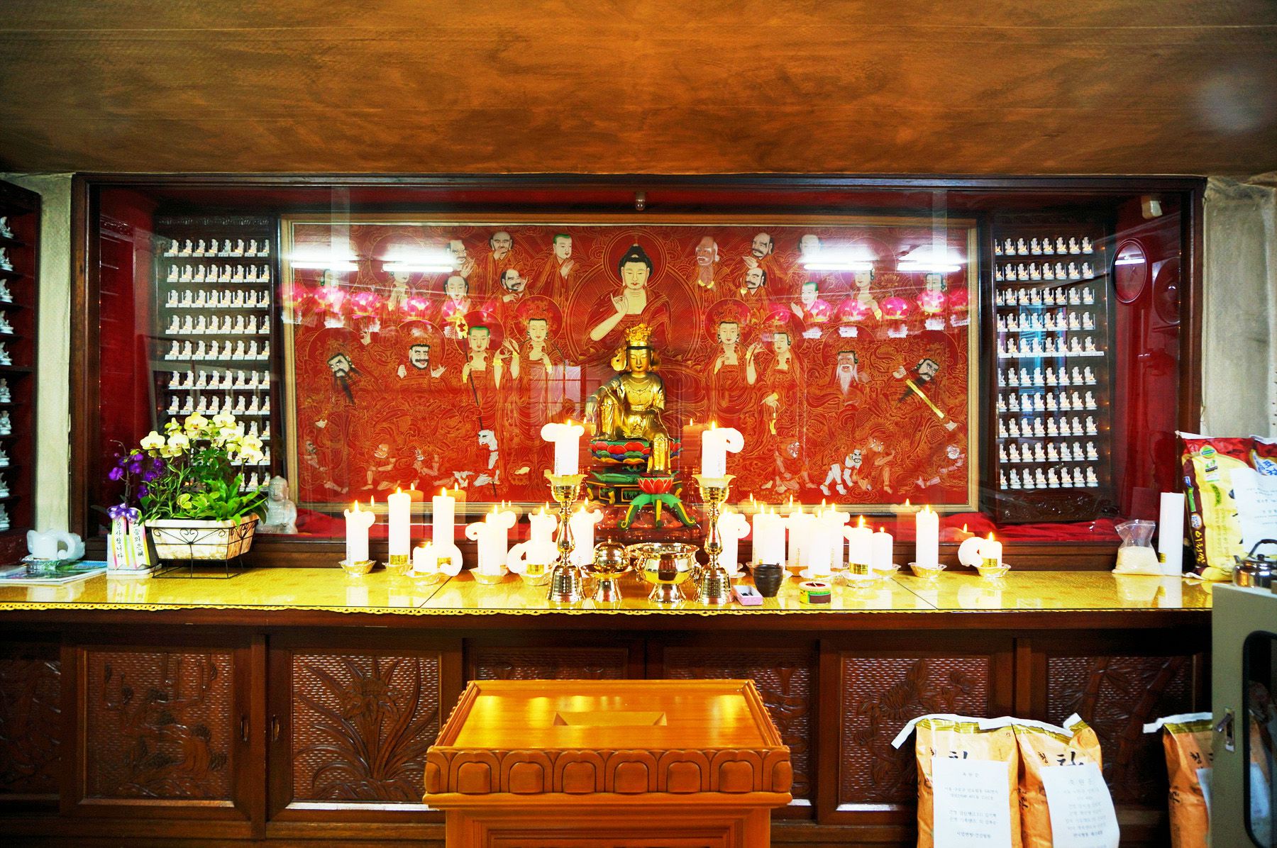 보타사의 대웅전에는 뒤에 마애보살좌상이 계셔서 협시보살을 두지 않고 부처님만 모신 모습을 보실 수 있습니다.