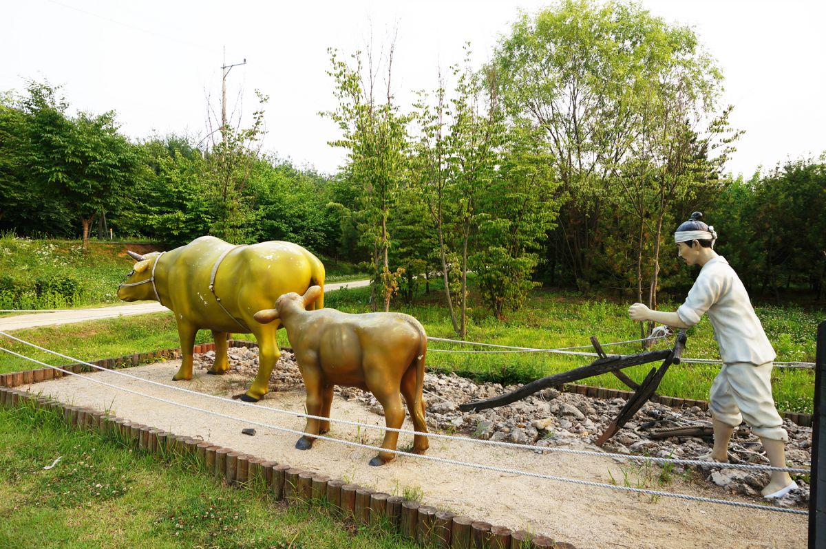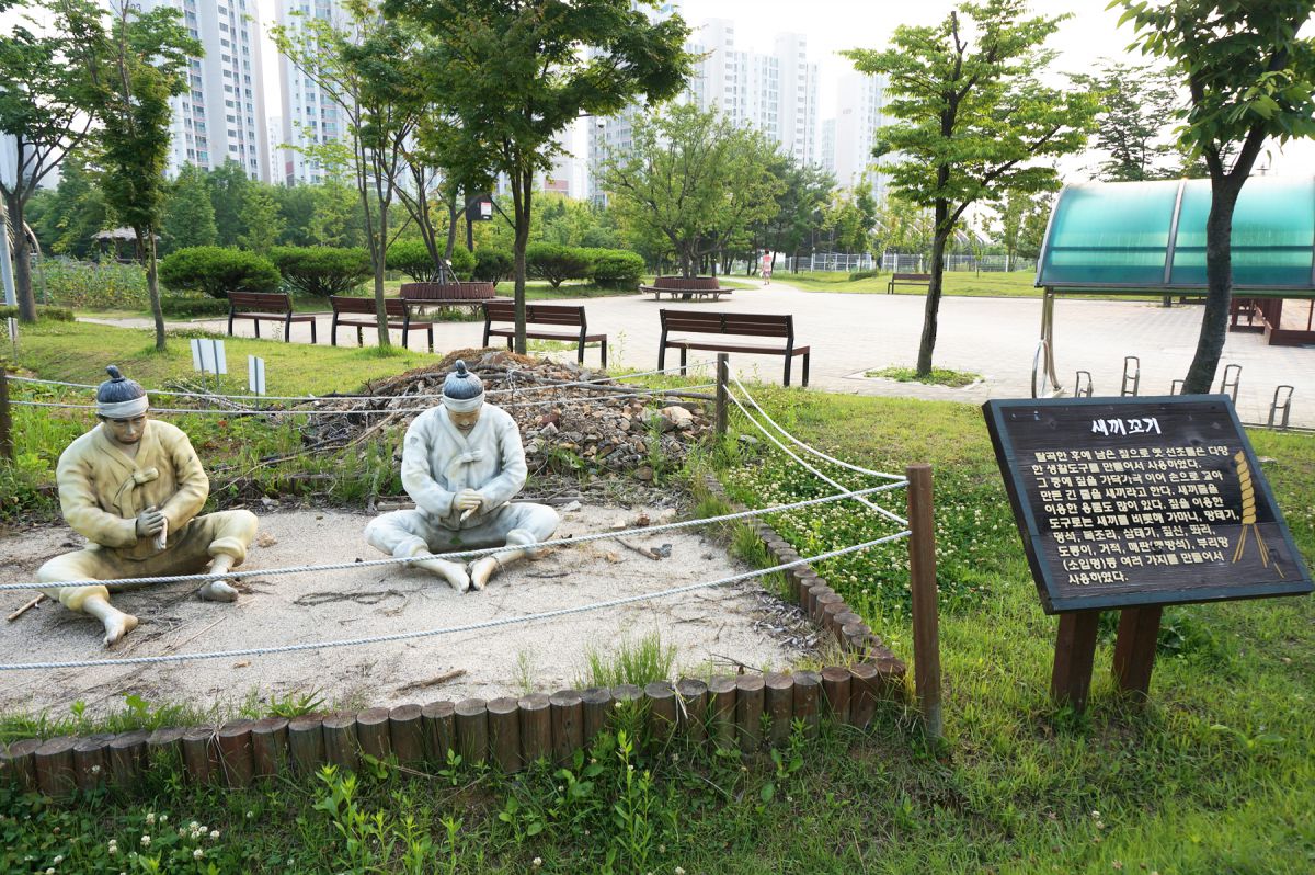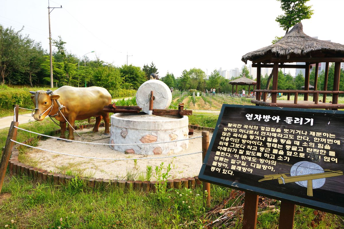 공원 내에 설치된 논갈이, 벼 베기, 탈곡하기, 연자방아 돌리기, 새끼 꼬기 등의 조형물은