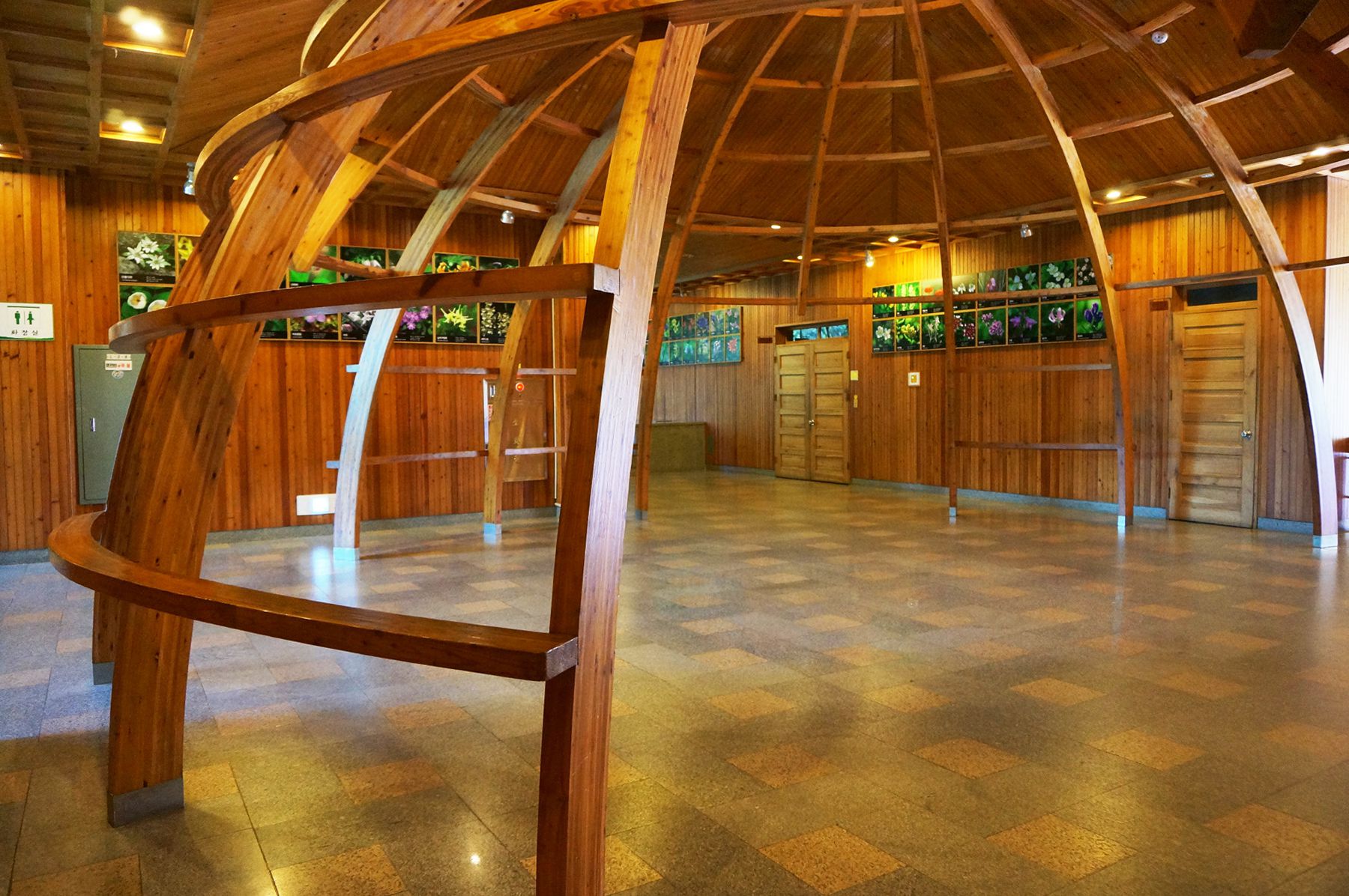 낙엽송과 잣나무를 활용하여 만든 집성돔은 다양한 종류의 식물 사진과 함께 휴식을 취할 수 있는 공간을 제공하고 있습니다.