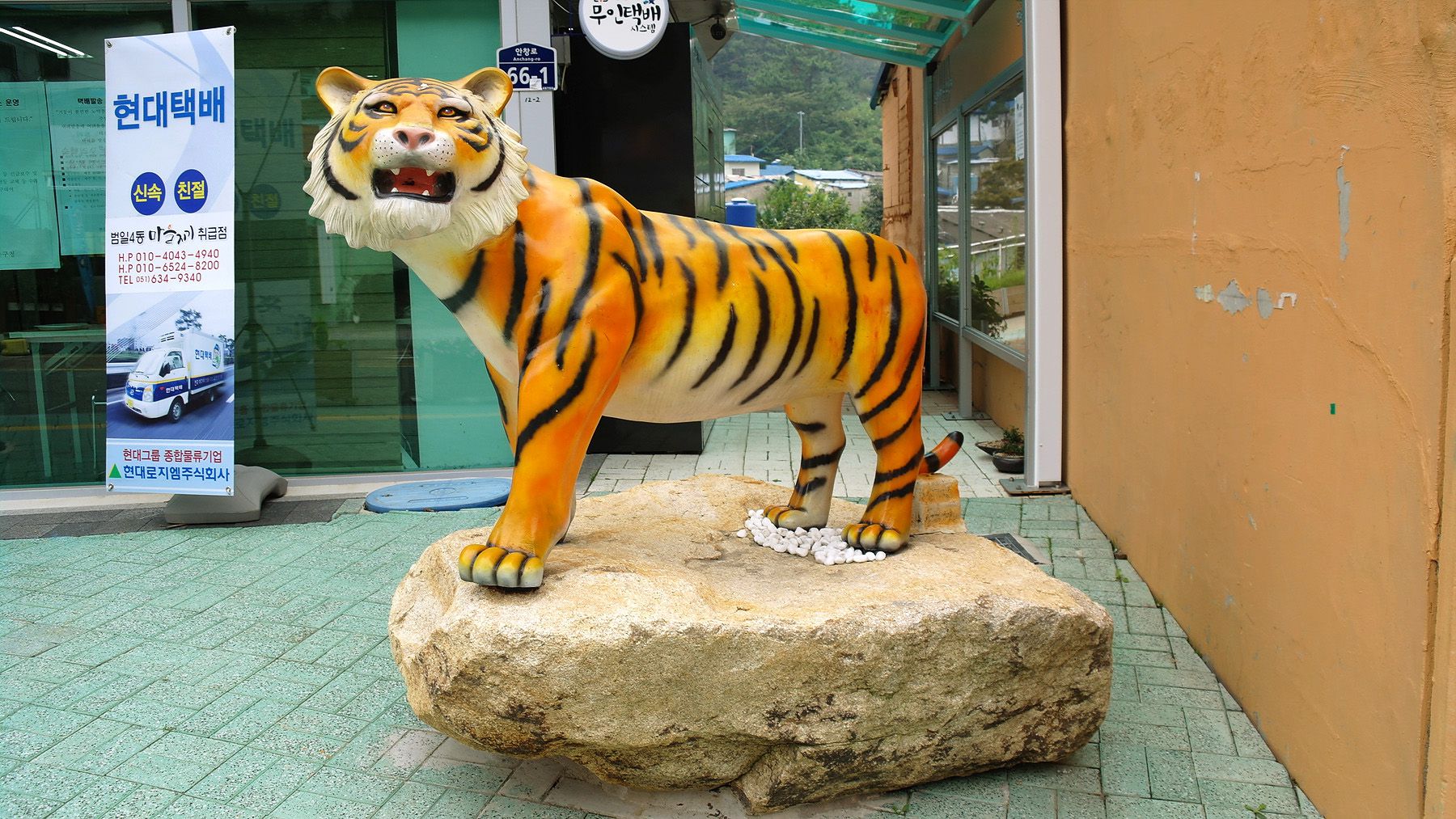 마을회관 입구에서 늠름하게 서 있는 호랑이 한 마리를 만날 수 있습니다.