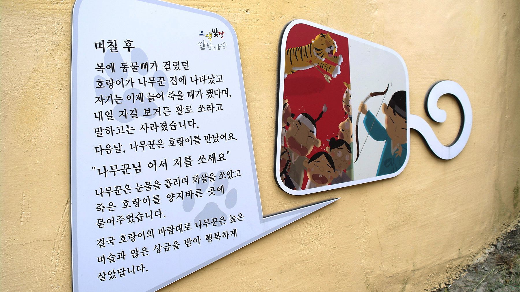 마을 입구에는 호랭이 마을의 유래와 호랑이에 관련된 다양한 이야기를 소개하고 있습니다.