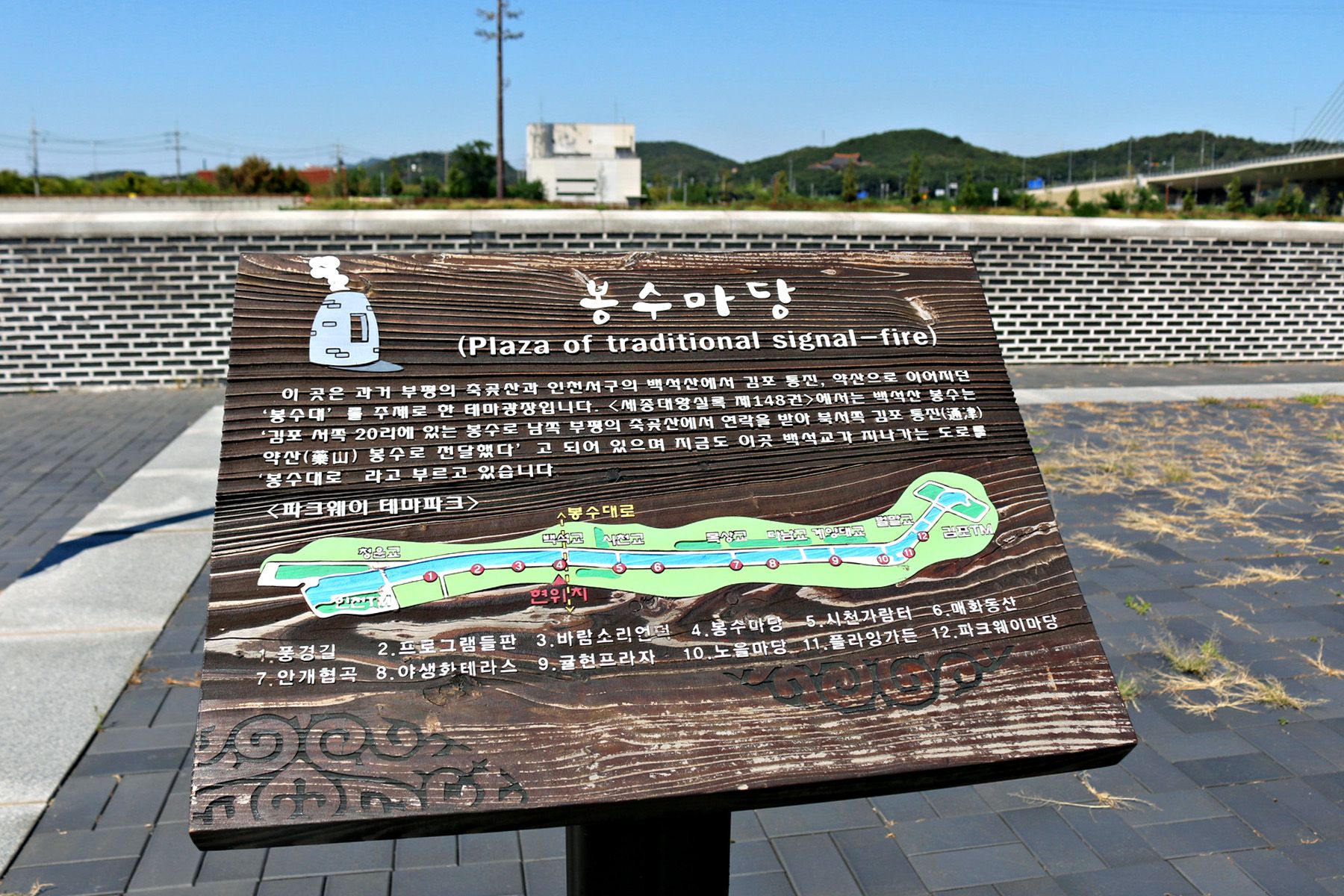 아라뱃길에 위치해 있는 봉수마당은 백석산에서 김포 통진, 약산으로 이어지던 '봉수대'를 테마로 조성된 광장입니다.